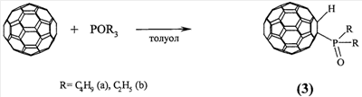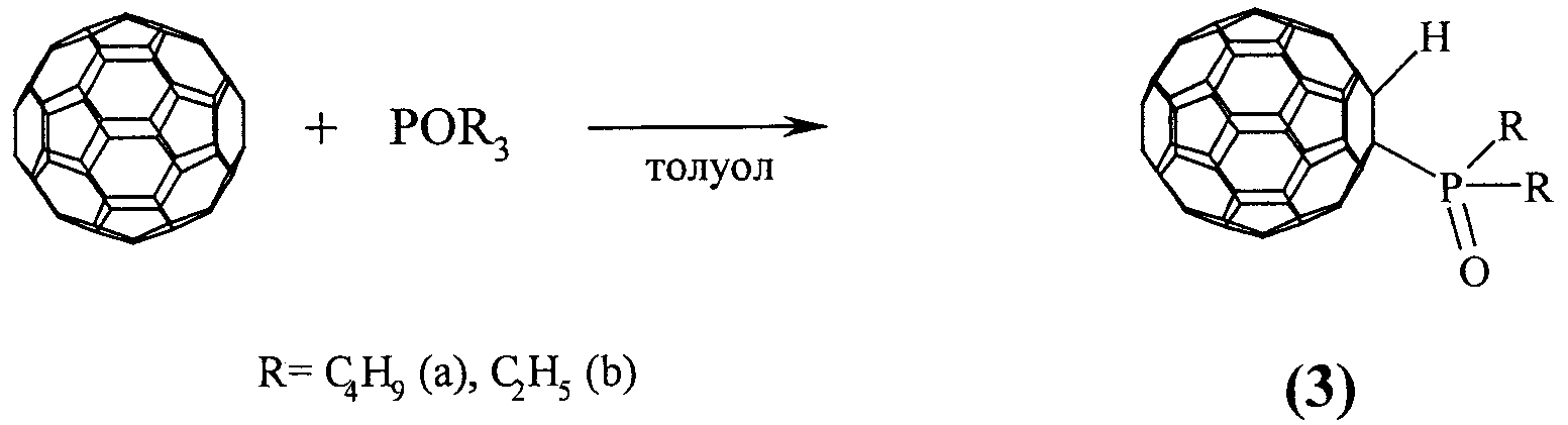 Известен способ ([2], S.-H.Wu, W.-Q.Sun, D.-W.Zhang, L.-H.Shu, H.-M.Wu, J.-F.Xu, X.-F.Lao. Tetrahedron Lett., 1998, 39, 9233-9236) получения соединения формулы (3) реакцией присоединения оксида триалкилфосфина к С60 в кипящем толуоле с выходом 48% по схеме