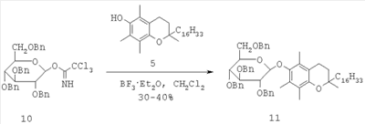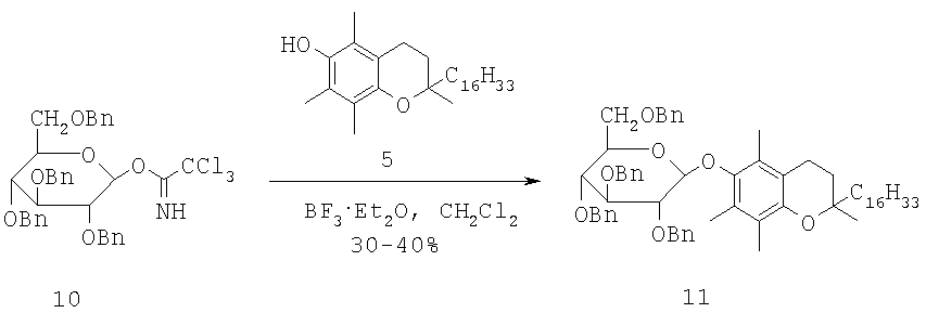 Среди исследованных в реакции гликозилирования -токоферола кислотных катализаторов наиболее эффективным оказался эфират трехфтористого бора. С его использованием взаимодействием трихлорацетоимидата (10) с соединением 5 был получен бензилированный -гликозид