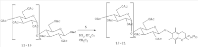 Причем в то время, как ацетаты -аномеров (12)-(16) легко вступали в реакцию гликозилирования, -аномеры вообще не реагировали в этих условиях, что является серьезным недостатком. Такая разница в реакционной способности – и -аномеров ацетилированных сахаров в реакциях гликозирования фенолов, катализируемых BF3·OEt2, наблюдалось также при использовании других гликозильных акцепторов [M.L.Wolfrom, A.Thompson, Methods Carbohydr. Chem. 1962, 2, 211-215; V.Vill, T.Böcker, J.Thiem, F.Fischer. Lig. Crust., 1989, 6, 349-356].