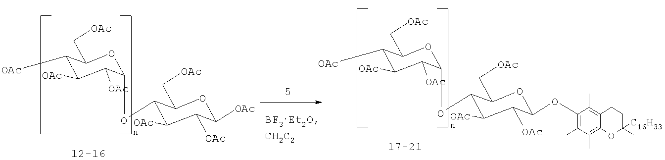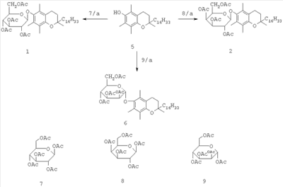 Основная проблема, которая возникает при гликозилировании -токоферола (5), обусловлена его высокой лабильностью, приводящей к открытоцепным димерным спиропроизводным и другим побочным продуктам. По этой причине успешно используемая для синтеза других О-гликозидов реакция Кенигса-Кнорра в случае -токоферола оказалась непригодной. Сообщалось о получении моно- и дисахаридов -токоферола с выходом, не превышающим 13%, в реакциях с перацетилированными сахарами, катализируемых n-толуолсульфокислотой [Suntar, Inc (1985) Jpn., Kokai Tokyo Koho Jp 60 56, 994 [85 56, 994]; Chem. Abst. 104 (1986) 34290a].