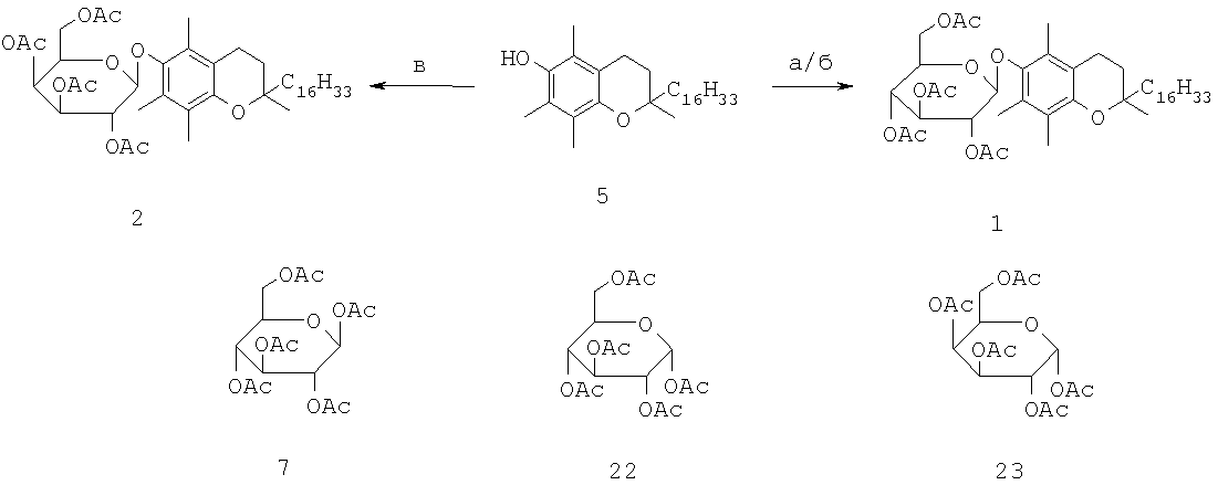 реакцией гликозилирования -токоферола, отличающийся тем, что -токоферол взаимодействует с – или -аномерами пентаацетатов D-глюко-(7, 22) или D-галактопираноз (23)