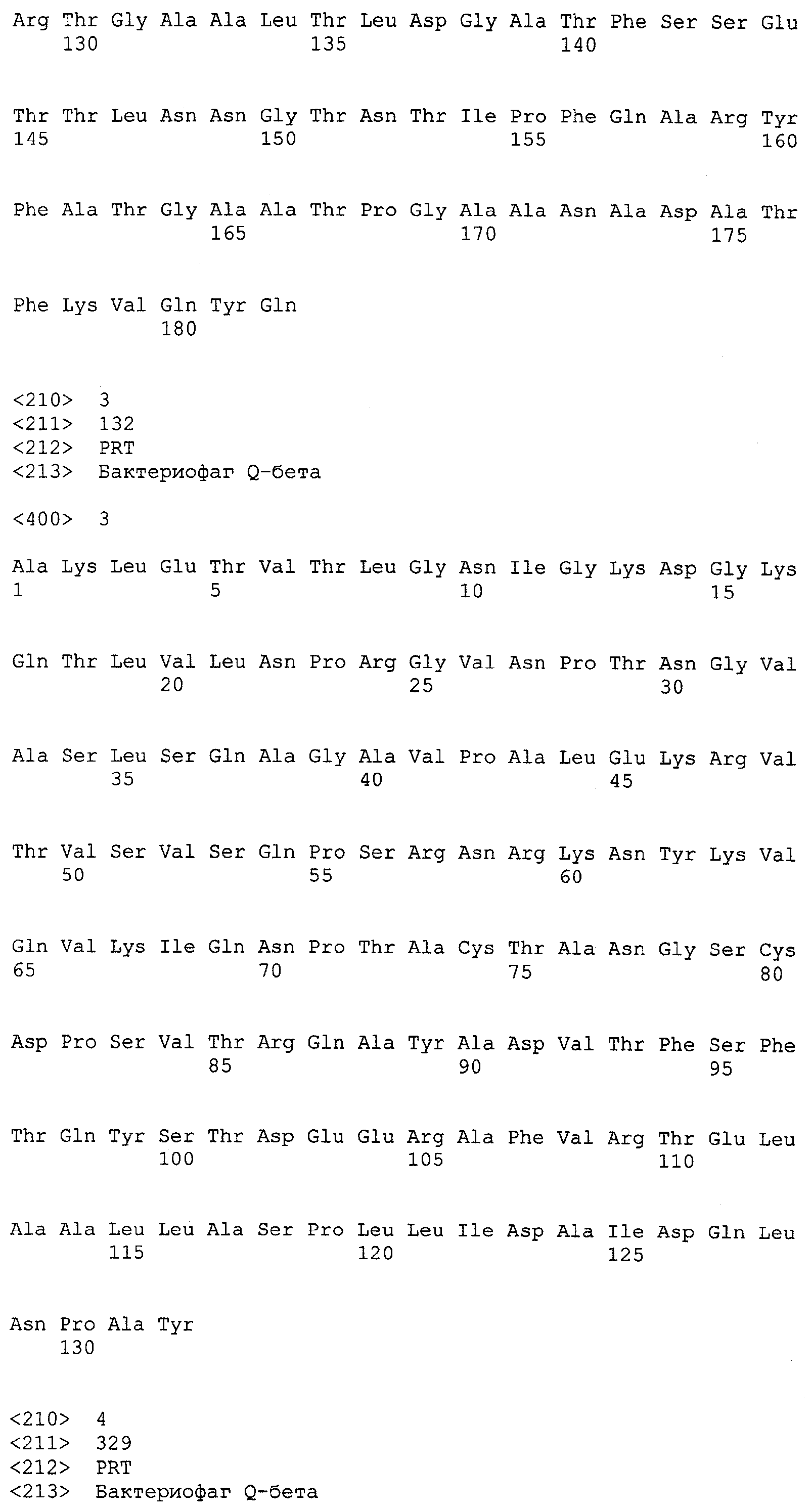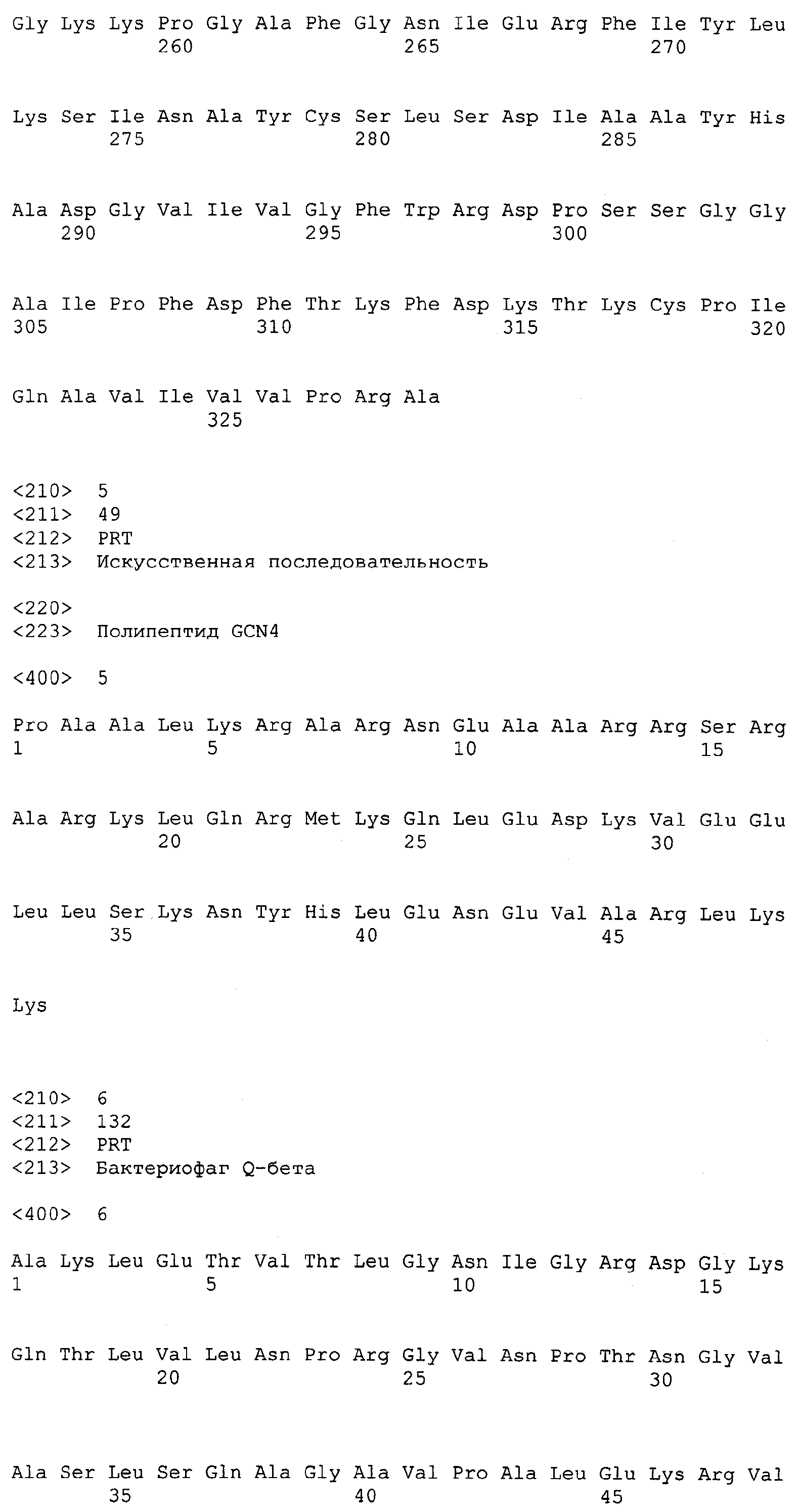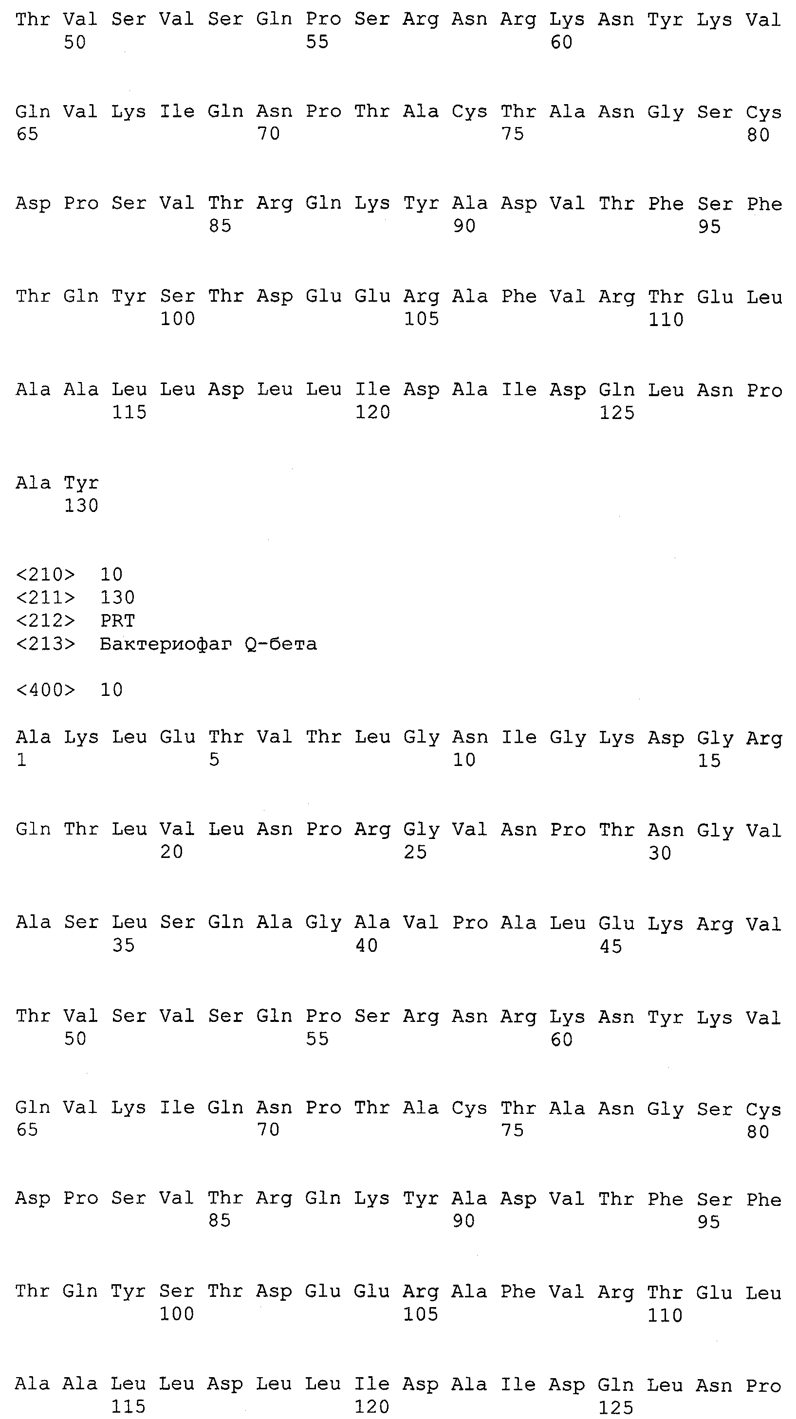 CLASS=”b560m”recombinant papillomavirus particles, Proc. Natl. Acad. Sci. USA, 1999, v.96, n.5, p.2373-2378. WO 0023955 A1, 27.04.2000. KOLETZKI D. et al. Mosaic hepatitis В virus core particles allow insertion of extended foreign protein segments, J. Gen. Virol., 1997, v.78, Pt 8, p.2049-2053. KOZLOVSKA T.M. et al. RNA phage Q beta coat protein as a carrier for foreign epitopes, Intervirology, 1996, v.39, n.1/2, p.9-15. БАЗА ДАННЫХ «BLAST», Chain C. Bacteriophage Q Beta Capsid, под №1QBE_C GI:1633138, размещено 10.01.1996. БАЗА ДАННЫХ «BLAST», Enterobacteria phage Qbeta, под №AAA16663.1 GI:145163, размещено 10.03.1994. RU 2169010 C2, 20.06.2001.