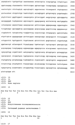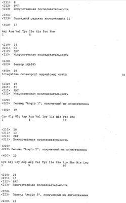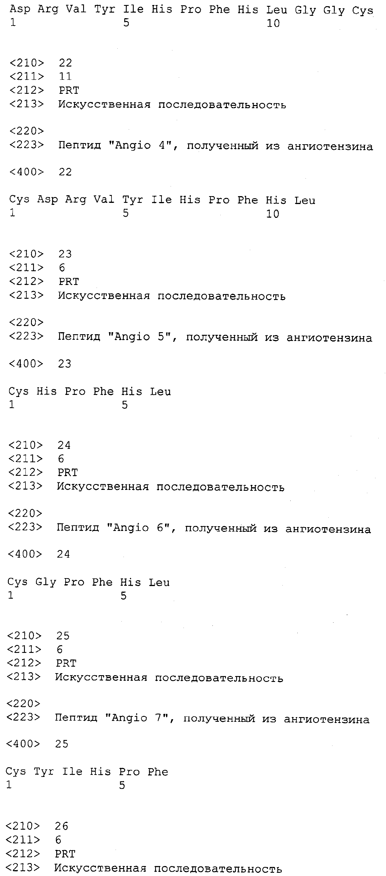 Ангиотензиновая пептидная составляющая. Используемый в данном описании термин «ангиотензиновая пептидная составляющая» относится к любой составляющей, независимо от того, имеет или нет данная составляющая биологическую активность нативного ангиотензина in vivo (например, природную гормональную активность в отношении рецепторов, включая ангиотензин I и II), которая способна действовать как иммуномиметик природных ангиотензиновых пептидов (т.е. которая иммунологически имитирует ангиотензин, так что генерируются антитела, которые связываются с нативными ангиотензиновыми пептидами). Таким образом, данная составляющая может подходящим образом содержать ангиотензиновый пептид, предпочтительно, ангиотензиноген, ангиотензин I (декапептид формулы Asp-Arg-Val-Tyr-Ile-His-Pro-Phe-His-Leu, SEQ ID NO: 16) или ангиотензин II (октапептид формулы Asp-Arg-Val-Tyr-Ile-His-Pro-Phe, SEQ ID NO: 17), или его функционально эквивалентный вариант. Следовательно, «ангиотензиновая пептидная составляющая» охватывает «ангиотензиновый пептид», как данный термин определен в данном описании. Такие функционально эквивалентные варианты могут включать модификации последовательности ангиотензина I или II с единичной или множественными аминокислотными заменами, добавлениями или делециями, и также последовательности, где аминокислотные остатки химически модифицированы, но которые, несмотря на это, сохраняют иммуногенную активность ангиотензина. Такие функционально (или иммунологически) эквивалентные варианты могут иметь место как природные биологические вариации, или они могут быть получены с использованием известных и стандартных способов, например, химического синтеза или модификации, мутагенеза, например, сайт-специфического или случайного мутагенеза, и т.д. Для целей данного определения ключевой чертой, касающейся модификации, является то, что ангиотензиновый пептид сохраняет способность действовать как иммуномиметик нативного ангиотензина. Так, например, аминокислота может быть замещена другой, которая сохраняет физико-химическую характеристику ангиотензинового пептида или его эпитопа(-ов), например, в плане плотности заряда, гидрофильности/гидрофобности, размера и конфигурации, и потому сохраняет иммунологическую структуру. Варианты «добавления» могут включать N- или С-концевые приращения, а также вставки внутри последовательности одной или нескольких аминокислот. Делеции могут иметь место внутри последовательности или могут представлять собой укорочения с N- или С-концов. Предпочтительными мутантными формами с делецией являются те, что обеспечивают индукцию антител против N- или, предпочтительно, С-конца. Такие антитела могут предотвращать образование активного ангиотензина II, но при этом оставлять возможность для деградации связанного с антителом ангиотензиногена, ангиотензина I или ангиотензина II.