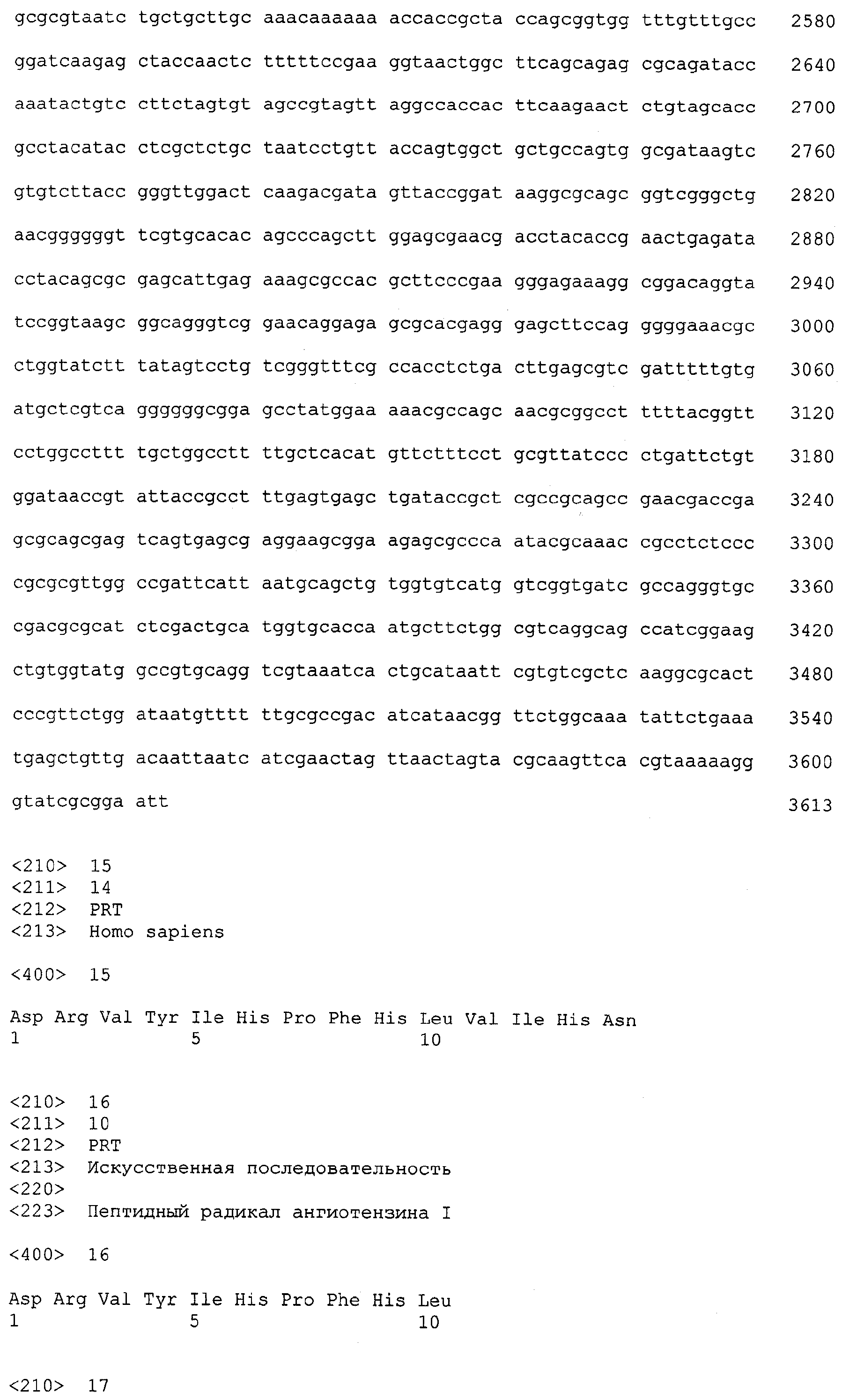 Артериальное кровяное давление у млекопитающих контролируется по большей части биохимическим каскадом, известным как ренин-ангиотензиновая система (RAS). Он инициируется высвобождением ренина из эпителиоидных клеток юкстагломерулярного аппарата почки после падения артериального кровяного давления. Ренин ферментативно расщепляет пептид ангиотензиноген (аминокислотная последовательность: Asp-Arg-Val-Tyr-Ile-His-Pro-Phe-His-Leu-Val-Ile-His-Asn, SEQ ID NO: 15), который секретируется в сыворотку печенью. Данное расщепление приводит к образованию декапептида ангиотензина I (аминокислотная последовательность: Asp-Arg-Val-Tyr-Ile-His-Pro-Phe-His-Leu, SEQ ID NO: 16). Ангиотензин-превращающий фермент (АСЕ), который находится в эндотелии легких, за секунды отщепляет две С-концевые аминокислоты ATI с образованием ангиотензина II (аминокислотная последовательность: Asp-Arg-Val-Tyr-Ile-His-Pro-Phe, SEQ ID NO: 17). В то время как ангиотензин I является в организме очень короткоживущим и не имеет или имеет очень слабую сосудосуживающую активность, ангиотензин II оказывает сильное действие на систему циркуляции, а также на эндокринную систему. Повышенные концентрации активированного RAS ангиотензина II вызывают суживание сосудов, задержку почками солей и воды, причем оба данных эффекта вносят вклад в повышенное артериальное давление (гипертензию), которое может приводить к повреждению сердечно-сосудистой системы. Возможными клиническими проявлениями гипертензии являются инсульт, инфаркт, застойная сердечная недостаточность, почечная недостаточность или кровоизлияние в сетчатку.