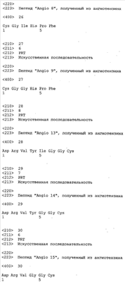 Конъюгаты и конъюгаты по изобретению индуцируют иммунный ответ, включая продукцию антител. Поэтому еще в одном осуществлении данное изобретение относится к способам продукции антител против одного или нескольких ангиотензиновых пептидов или ангиотензиновых пептидных составляющих. Такие антитела по изобретению могут использоваться для лечения или профилактики физических нарушений, ассоциированных с RAS, и для детекции ангиотензиновых пептидов или ангиотензиновых пептидных составляющих, например, в способах диагностики физических нарушений, ассоциированных с присутствием одного или нескольких компонентов RAS в тканях или циркуляторном русле животного.