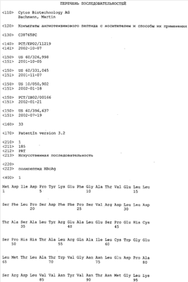 Участок связывания, второй. Используемое в данном описании выражение «второй участок связывания» относится к элементу, ассоциированному с антигеном или антигенной детерминантой, с которым может ассоциировать первый участок связывания, локализованный на поверхности коровой частицы и вирусоподобной частицы, соответственно. Второй участок связывания антигена или антигенной детерминанты может представлять собой белок, полипептид, пептид, сахар, полинуклеотид, природный или синтетический полимер, вторичный метаболит или соединение (биотин, флуоресцеин, ретинол, дигоксигенин, ионы металлов, фенилметилсульфонилфторид), или их комбинацию, или их химическую реакционноспособную группу. По крайней мере, один второй участок связывания присутствует на антигене или антигенной детерминанте. Термин «антиген или антигенная детерминанта с, по крайней мере, одним вторым участком связывания», таким образом, относится к антигену или антигенной конструкции, содержащим, по крайней мере, антиген или антигенную детерминанту и второй участок связывания. Однако, в особенности для второго участка связывания неприродного происхождения, т.е. он не встречается в данном антигене или антигенной детерминанте в природе, данный антиген или антигенная конструкция содержат «аминокислотный линкер».