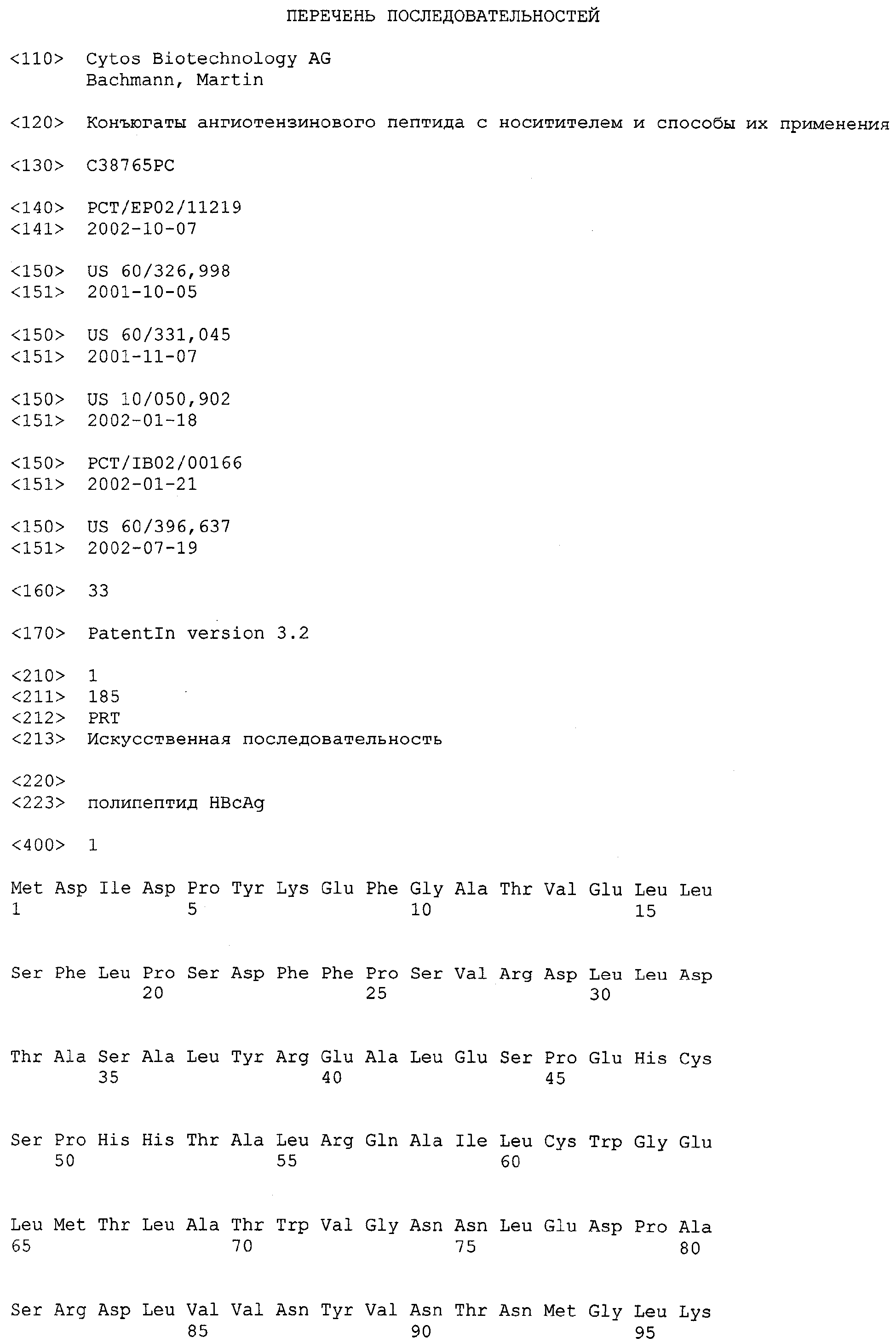 16. Конъюгат по п.1, где только один из указанных вторых участков связывания связан с указанным первым участком связывания посредством по меньшей мере одной непептидной ковалентной связи, что приводит к одиночному и единообразному типу связывания указанной ангиотензиновой пептидной составляющей с указаннной коровой частицей, где только один указанный второй участок связывания, который связан с указанным первым участком связывания, является сульфгидрильной группой, и где указанная ангиотензиновая составляющая и указанная коровая частица взаимодействуют посредством указанной связи с образованием упорядоченной и повторяющейся антигенной молекулы.