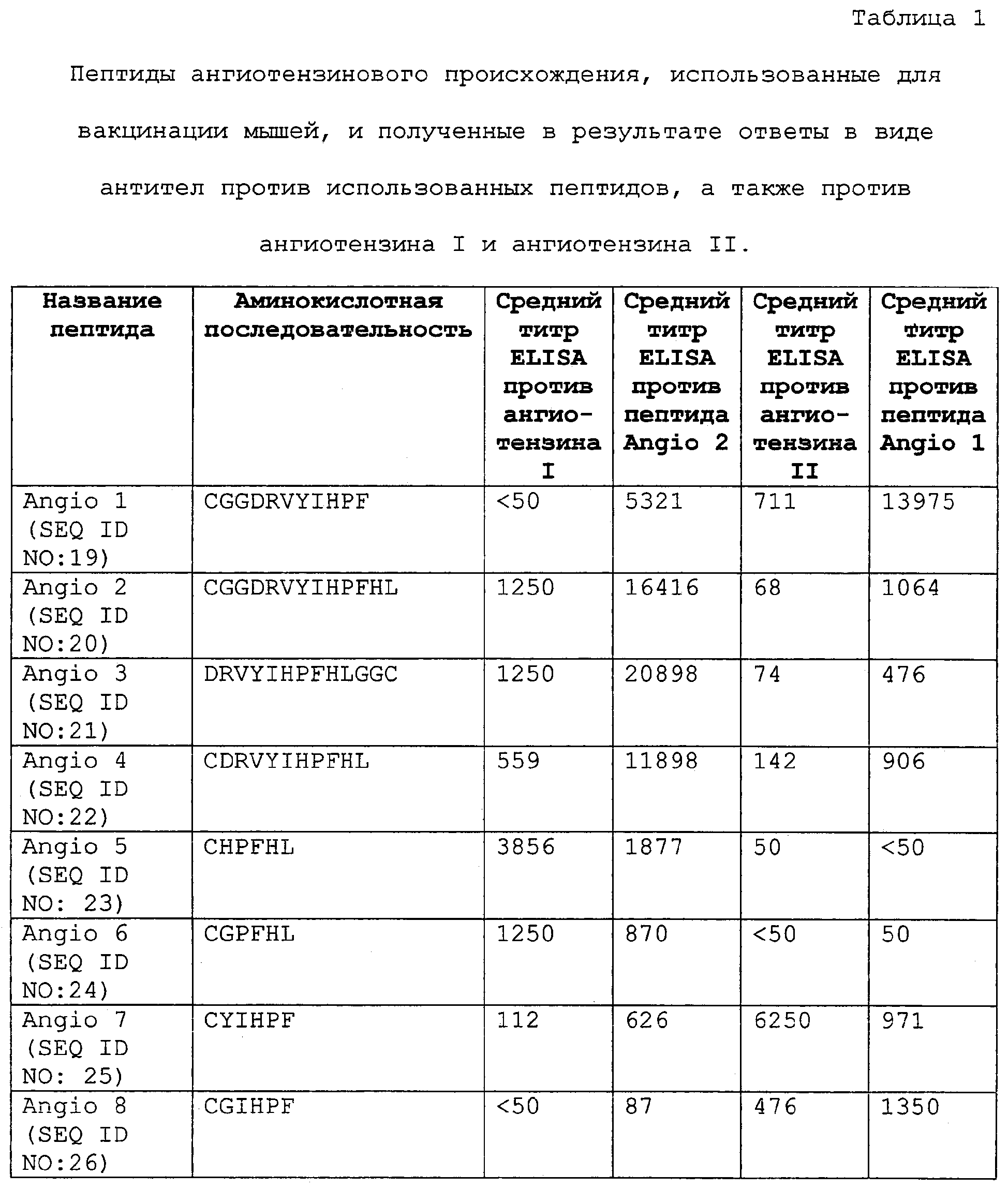 Осуществимость вакцинации против компонентов RAS с целью модуляции гипертензии показана на экспериментальных животных (для обзора см. Michel, Am. Heart J. 117:756 (1989)). Вакцинация против ренина была эффективной для понижения кровяного давления, однако, животные страдали от аутоиммунного нефрита (Michel et al., Circulation 81:1899 (1990); Lo et al., Hypertension 16:80 (1990)). Количество данных по активной иммунизации против гомологичного АСЕ очень ограничено. В одном из сообщений описана вакцинация кроликов, но только 1 из 50 животных характеризовалось детектируемым уровнем антител против АСЕ (Softer, Fed. Proc. 42:2735 (1983)). Пассивный перенос иммунной сыворотки против АСЕ может снижать кровяное давление у кроликов, но ведет к иммуноаллергической реакции с отеком легким, возможно, поскольку АСЕ экспрессируется в мембраносвязанной форме в легких (Cadwell, FEBS Lett. 63:82 (1976)). Не доступны сообщения об активной иммунизации против ангиотензиногена, однако, в некоторых исследованиях анализировалась осуществимость вакцинации против ангиотензина-I и ангиотензина-II. В двух исследованиях сообщается об эффекте на кровяное давление (Christlieb, J. Clin. Invest. 48:1506 (1969); Gardiner, Br. J. Pharmacol. 129:1178 (2000)) у вакцинированных животных, и не отмечалось аутоиммунитета. Однако множество исследований по вакцинации ангиотензиновыми пептидами имели отрицательные результаты, возможно, потому что индуцированные титры антител против ангиотензиновых пептидов были слишком низкими, или потому что специфичность индуцированных антител не была оптимальной. Вероятно, что вакцина, которая направлена только на ангиотензин II, не имеет такого эффекта на RAS, как вакцина, которая индуцирует антитела против ангиотензина II, а также против ангиотензина I и, возможно, также против их предшественника ангиотензиногена.