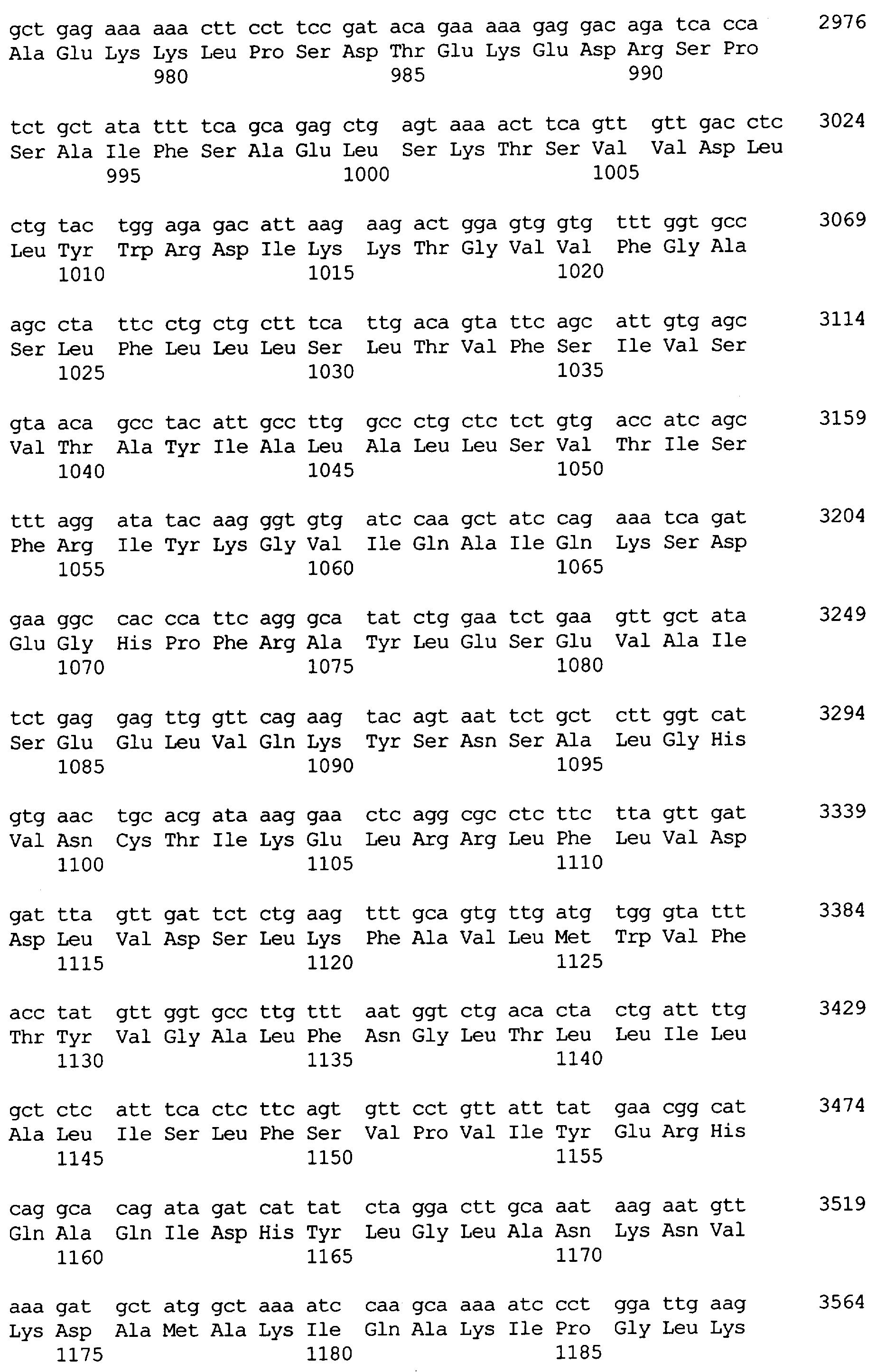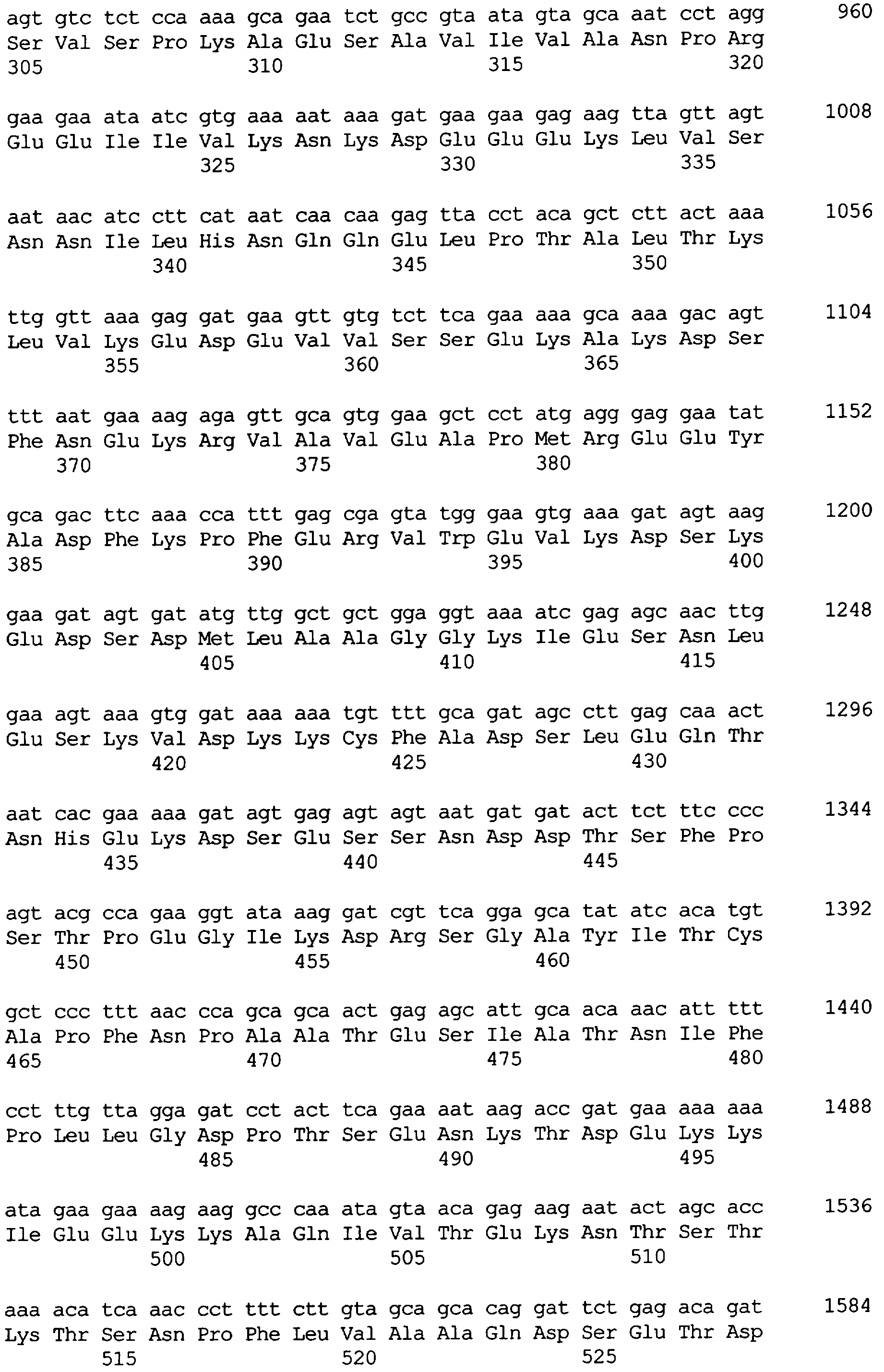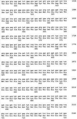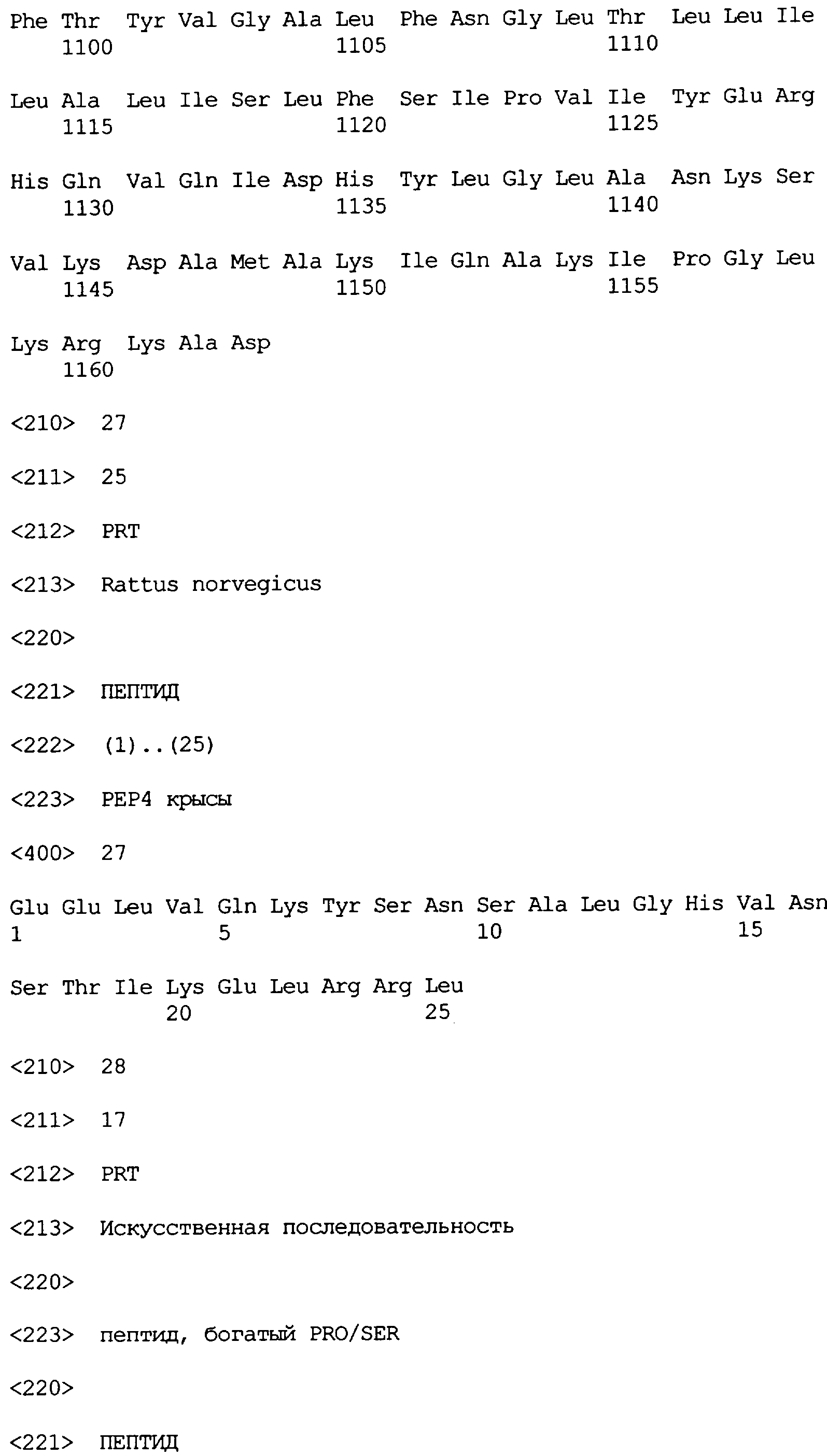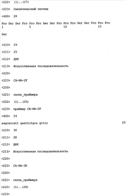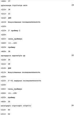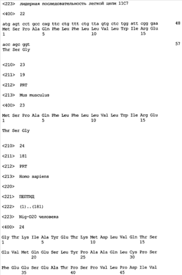 Первая или вторая рекомбинантная ДНК предпочтительно имеют третью часть, которая расположена до первой части и кодирует часть лидерного пептида; эта третья часть начинается с кодона, кодирующего первую аминокислоту лидерного пептида, и заканчивается кодоном, кодирующим последнюю аминокислоту лидерного пептида. Этот пептид требуется для секреции цепей организмом хозяина, в котором они экспрессируются, после чего пептид удаляется организмом хозяина. Предпочтительно третья часть первой рекомбинантной ДНК кодирует лидерный пептид, аминокислотная последовательность которого по существу идентична аминокислотной последовательности лидерного пептида тяжелой цепи, как показано в SEQ ID NO:21 (начиная с аминокислоты в положении – 19 и заканчивая аминокислотой в положении – 1). Также предпочтительно, чтобы третья часть второй рекомбинантной ДНК кодировала лидерный пептид, аминокислотная последовательность которого показана в SEQ ID NO:23 (легкая цепь, начинающаяся с аминокислоты в положении – 18 и заканчивающаяся аминокислотой в положении – 1).