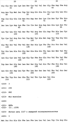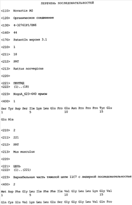Современное состояние дел в данной области таково, что при наличии представленной здесь информации квалифицированный специалист может синтезировать молекулы ДНК по изобретению, т.е. аминокислотные последовательности гипервариабельных участков и последовательности ДНК, их кодирующие. Метод конструирования вариабельных доменов гена описан, например, в ЕР 239400 и может быть коротко резюмирован следующим образом: клонируют ген, кодирующий вариабельный домен моноклонального антитела любой специфичности. Определяют сегменты ДНК, кодирующие каркасную часть и гипервариабельные области, и сегменты ДНК, кодирующие гипервариабельные области, удаляют таким образом, чтобы произошло слияние сегментов ДНК, кодирующих каркасные области, с образованием удобных сайтов рестрикции в местах соединения. Эти сайты рестрикции могут быть образованы в определенных положениях стандартными средствами мутагенеза молекулы ДНК. Синтезируют наборы двухцепочечных CDR, имеющие заданные последовательности CDR1-11C7, CDR2-11C7, CDR3-11C7, CDR1′-11C7, CDR2′-11С7 и CDR3′-11C7. Получают фрагменты с липкими концами, посредством которых они могут быть лигированы к каркасной области по стандартному протоколу получения полноразмерной молекулы ДНК, кодирующей вариабельный домен иммуноглобулина.
