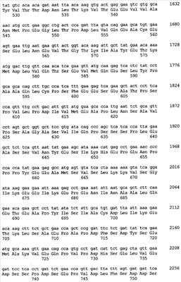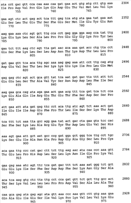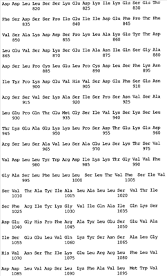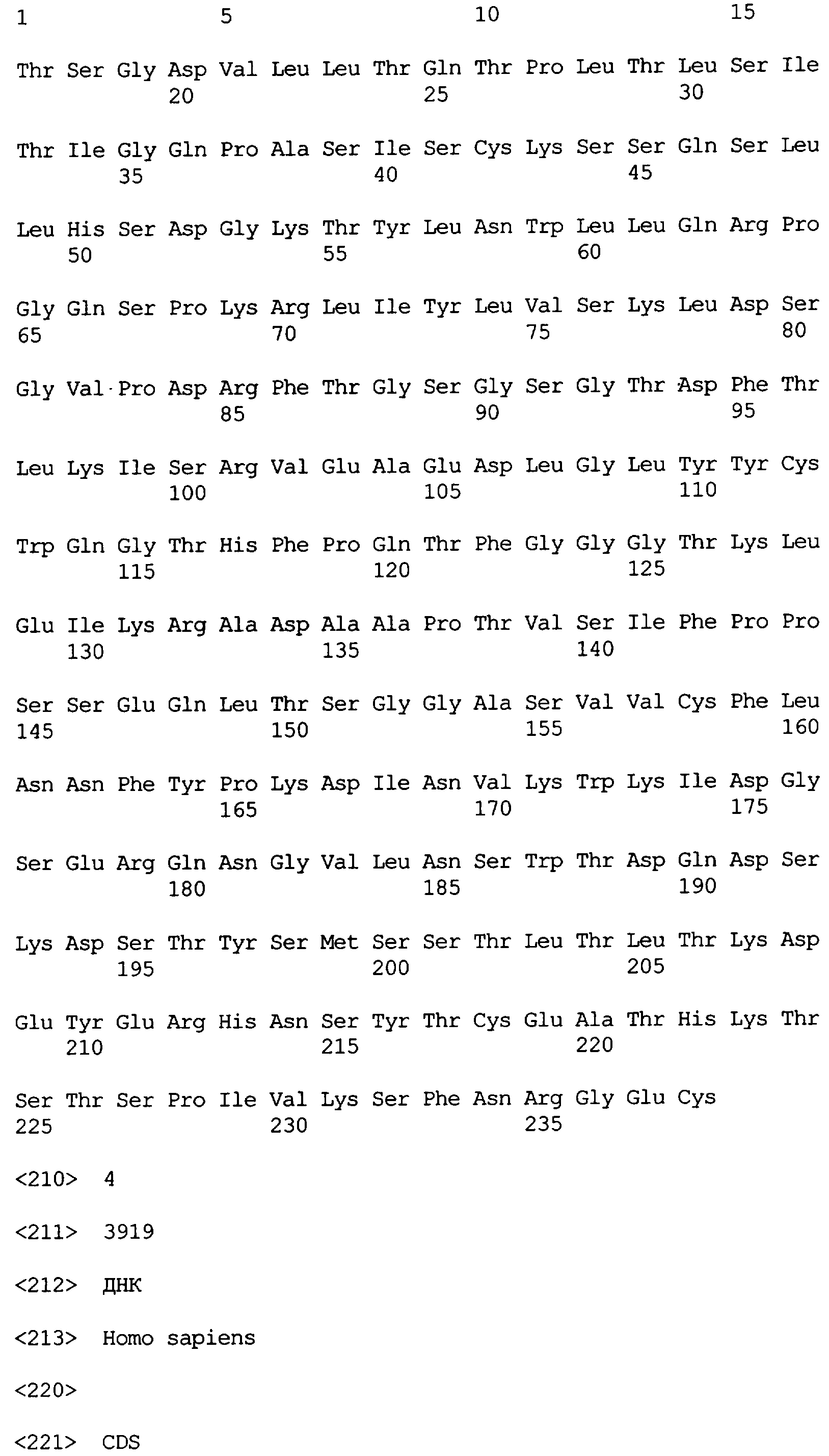 (е) N-концевое секвенирование областей VL и VH: Анализ аминокислотных последовательностей проводили на собранных после ВЭЖХ пиках цепей H+L. Аминокислотную последовательность определяли с помощью системы для N-концевого секвенирования белков Hewlett Packard G1000A N-terminal Protein Sequencing System. Система автоматически осуществляет реакции Эдмана на белковых пробах, собранных на миниатюрных поглощающих бифазных колонках. Для повышения химической эффективности метода, минимизации фазовых сдвигов и таким образом расширения анализа последовательности до примерно 50 остатков применяли метод химической оптимизации (двойная пара 3.0). Анализ РТН-аминокислот проводили on-line в системе Hewlett Packard HP 1090 HPLC System, оснащенной трехкомпонентной насосной системой и узкой колонкой РТН размером (2,1 мм×25 см).