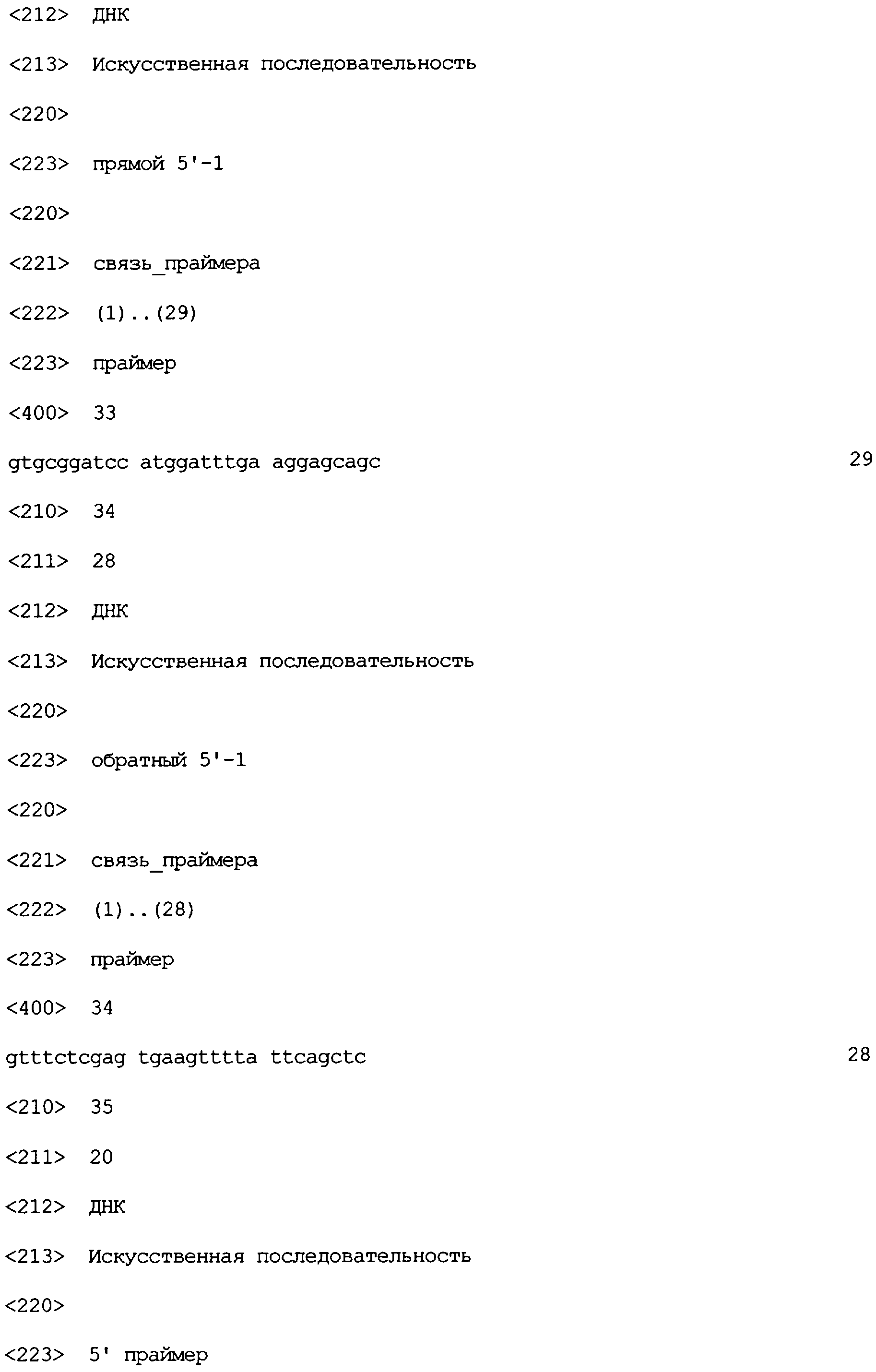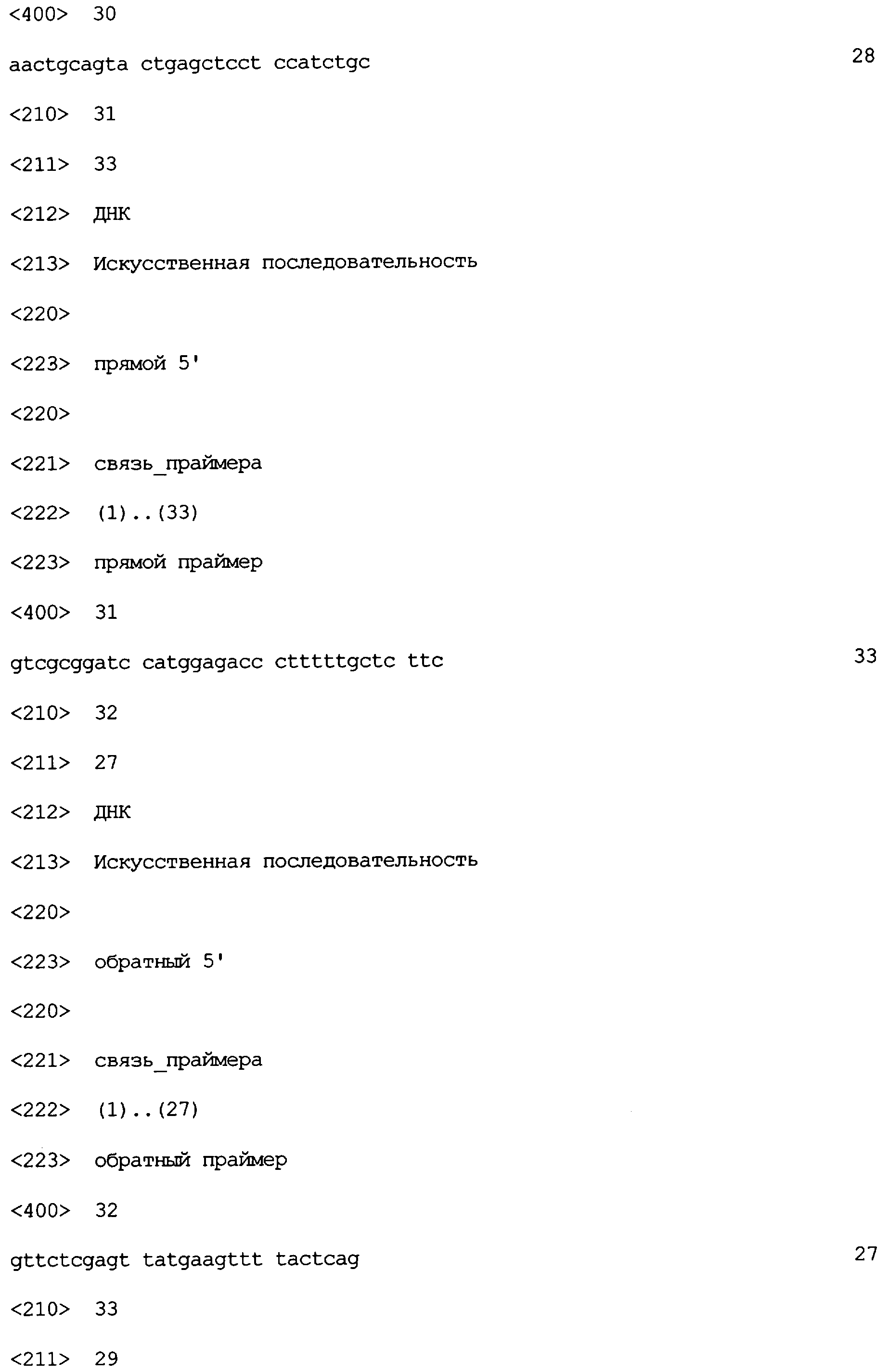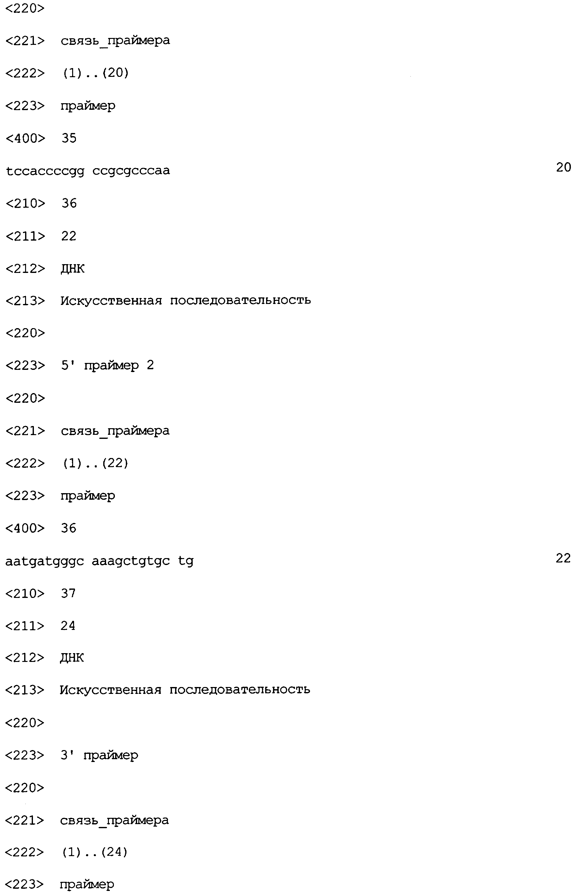 Библиотеку кДНК создавали путем обратной транскрипции в следующих условиях: реакционная смесь состояла из 2 мкл мРНК, 2 мкл 10-кратного буфера для обратной транскрипции, 2 мкл праймера (dT)20 (10 мкМ), 0,5 мкл RNasin (Promega, 40 Е/мл), 2 мкл dNTP (no 5 мМ каждого), 1 мкл обратной транскриптазы Omniscript (Qiagen, кат. # 205110), 10,5 мкл ddH2O; реакцию проводили 1 ч при 37°С. При проведении ПЦР-амплификации кДНК, кодирующих VH и VL, использовали ДНК-полимеразу ProofStart DNA-фермент, проверяющий правильность считывания.