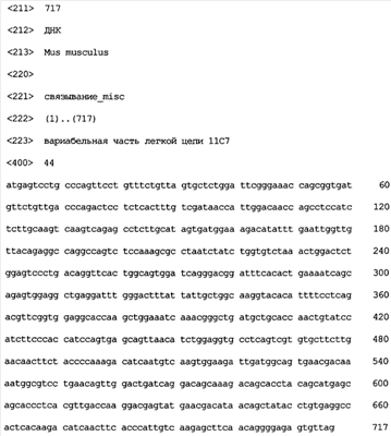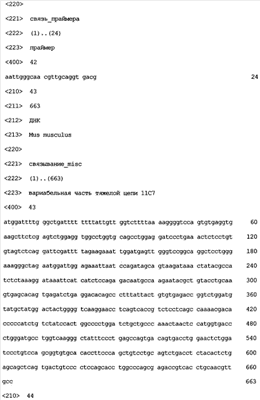 ПЦР легкой и тяжелой цепи: реакционная смесь состояла из 2 мкл кДНК, 5 мкл 10-кратного реакционного буфера, 3 мкл dNTP (по 5 мМ каждого), 2 мкл 5′-праймера (10 мкМ) (см. Таблицу 2), 2 мкл 3′-праймера (10 мкМ) (см. Таблицу 2), 1 мкл ProofStart (Qiagen, кат.# 202203), 36 мкл ddH2O. Условия ПЦР: 95°С/5 мин, (95°С/40 с, 53°С/1 мин, 72°С/1 мин)×35, 72°С/10 мин. Продукты ПЦР лигировали напрямую с плазмидой pCRbluntTOPO (Invitrogen). Производили трансфекцию 10 клеток TOP (Invitrogen) полученной лигационной смесью и отбирали несколько клонов. Последовательности нуклеотидов в кДНК вариабельной части тяжелой цепи мкАТ 11С7 (V-H, SEQ ID NO:43) и легкой цепи мкАТ 11С7 (V-L, SEQ ID NO:44) определяли на секвенаторе ABI. Последовательность аминокислот V-H и V-L показана в SEQ ID NO:2 (V-H) и SEQ ID NO:3 (V-L). Все праймеры, использованные для ПЦР-амплификации кДНК VH и VL, синтезированы на фирме MWG Biotech (Германия).