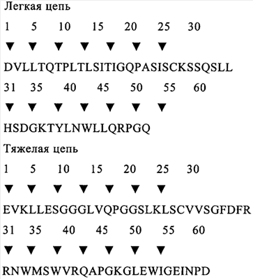 Анализ масс подтвердил выделение гомогенных препаратов тяжелых и легкий цепей мышиных 11C7-IgG1. Н-цепь представляла собой одиночную гликозилированную цепь, существующую в двух формах с разницей в одном С-концевом лизиновом остатке. Общий анализ масс тяжелых и легких цепей показал, что для обеих цепей существует единая масса. ВЭЖХ мышиных 11С7-IgG1 продемонстрировала наличие одного пика. В результате очистки путем ВЭЖХ с последующим восстановлением и алкилированием были получены чистые тяжелые и легкие цепи. Провели N-концевое секвенирование тяжелой и легкой цепи. Были идентифицированы от 45 до 55 аминокислот N-концевых последовательностей L- и Н-цепей методом химической деградации.