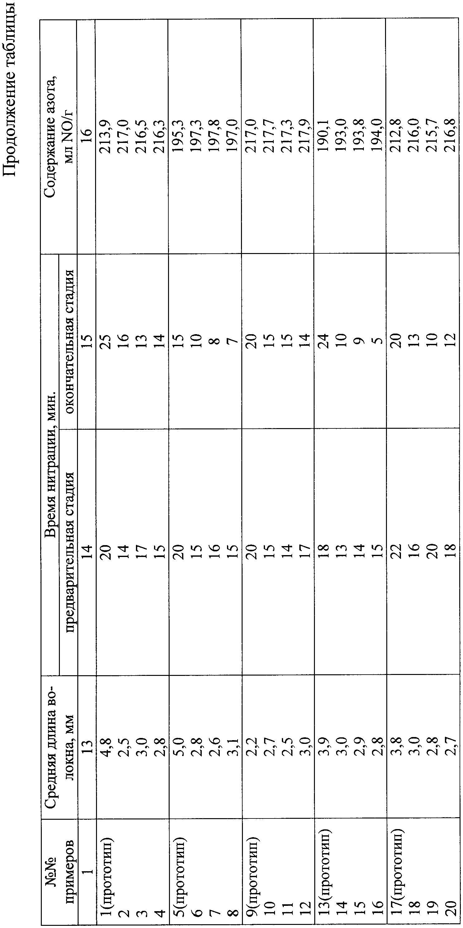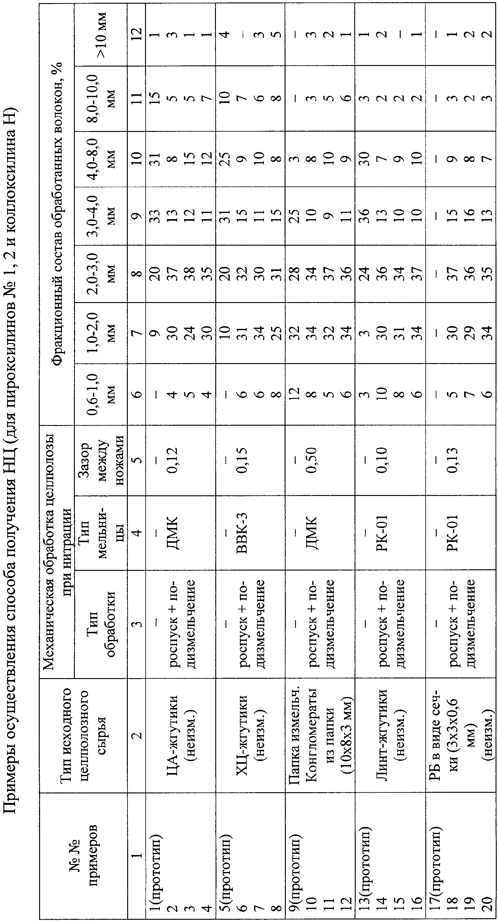 В примерах для прототипа (№1, 5, 13, 17) целлюлозное сырье (марок ЦА, ХЦ, линт и РБ) согласно штатной технологии перед нитрацией не измельчалось, а древесная целлюлоза в форме папки (пример №9 – прототип) перед нитрацией предварительно измельчалась (с роспуском) сухим способом на молотковой мельнице. В примерах №10-12 древесная целлюлозная папка перед нитрацией только разрывалась (раздроблялась) на колковых разрывных аппаратах сухим методом на конгломераты размерами примерно 10×8×3 мм. Из приведенных примеров следует, что в результате механоструктурной обработки целлюлозного сырья, осуществленной после его предварительной нитрации, независимо от исходного вида и формы, происходит преимущественное образование однородных по длине волокон целлюлозы с относительно узким интервалом дисперсности (1,0-3,5 мм), обладающих средней длиной порядка 2,5-3,0 мм. В процессе такой обработки, кроме относительного укорочения волокон, происходят интенсивные процессы фибрилляции и роспуска, что, в конечном итоге, приводит к ускоренной и равномерной по объему нитрации (этерификации) целлюлозного сырья: так, во всех примерах НЦ получаются однородными по содержанию азота. Предлагаемым способом можно получать как низкоэтерифицированные НЦ (различные коллоксилины), так и высокоэтерифицированные НЦ (пироксилины). Следует отметить, что в примере №9 получение НЦ из предварительно измельченной древесной целлюлозы в форме папки по технологии, принятой за прототип, сопровождается значительными потерями целлюлозного сырья в виде пыли (около 40% от первоначального ее количества). При изготовлении НЦ по предлагаемому способу потери целлюлозы не превышают установленных норм (2-4%). Предлагаемый способ получения НЦ, по сравнению с прототипом, имеет следующие преимущества: универсальность применения в комплексе со всеми известными периодическими и непрерывными технологиями производства НЦ любых марок; использование для получения НЦ всего разнообразия целлюлозного сырья, в том числе льняного, конопляного, плотных видов древесной целлюлозы в форме папки, волокнистого хлопкового линта с твердыми примесями; достижение в процессе механоструктурной обработки физической однородности суспензии НЦ, обуславливающей хорошие реологические свойства и высокую технологичность переработки нитромассы, что позволяет: – исключить забивку насосов и трубопроводов; – организовать легкую выгрузку из технологических емкостей и центрифуг; – устранить аварийные ситуации; – повысить в целом надежность и безопасность производства; сокращение в 10-20 раз потерь сырья в виде пыли при получении НЦ из древесной целлюлозы в форме папки; повышение качества продукции за счет получения однородных как по содержанию азота, так и по дисперсности, волокон НЦ. При этом основная концентрация (до 70-75%) однородных по длине волокон находится в относительно узком интервале дисперсности (1,0-3,5 мм); улучшение экологической обстановки на предприятии и вокруг него за счет исключения возможности термохимического разложения НЦ с залповыми выбросами значительного количества ядовитых окислов азота; сокращение за счет ускорения массообменных процессов общей продолжительности получения НЦ на 30-45% и повышение экономичности производства. На основе предлагаемого способа возможно создание современны