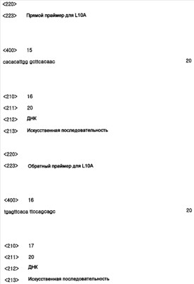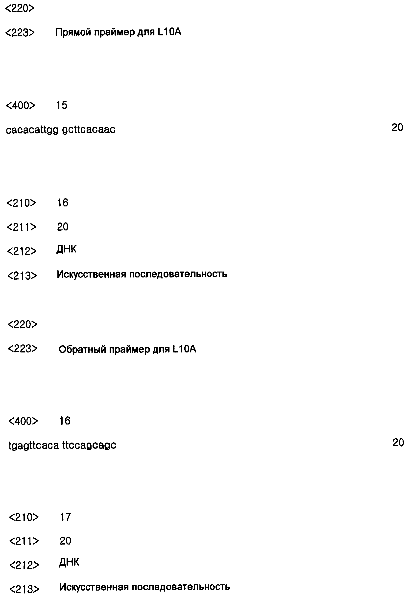 Нуклеотидные последовательности, представленные SEQ ID NO:15 и NO:16, представляют собой праймерные последовательности, используемые для ОТ-ПЦР с рибосомным белком L10A в примере 6.