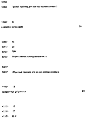 Нуклеотидные последовательности, представленные SEQ ID NO:17 и NO:18, представляют собой праймерные последовательности, используемые для ОТ-ПЦР пре-про-протеиназой 3 в примере 6.