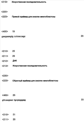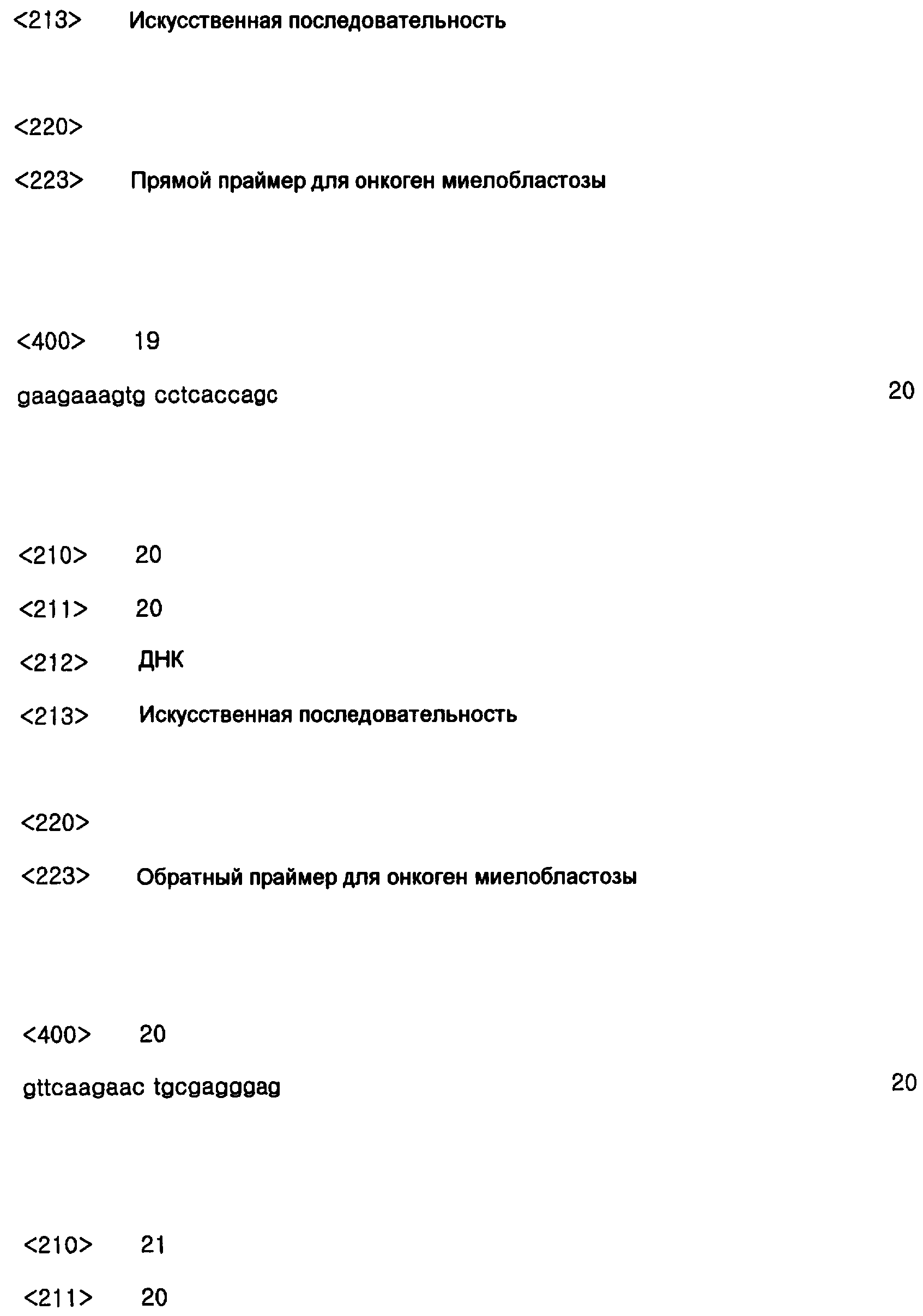 Нуклеотидные последовательности, представленные SEQ ID NO:19 и NO:20, представляют собой праймерные последовательности, используемые для ОТ-ПЦР с онкогеном миелобластоза в примере 6.