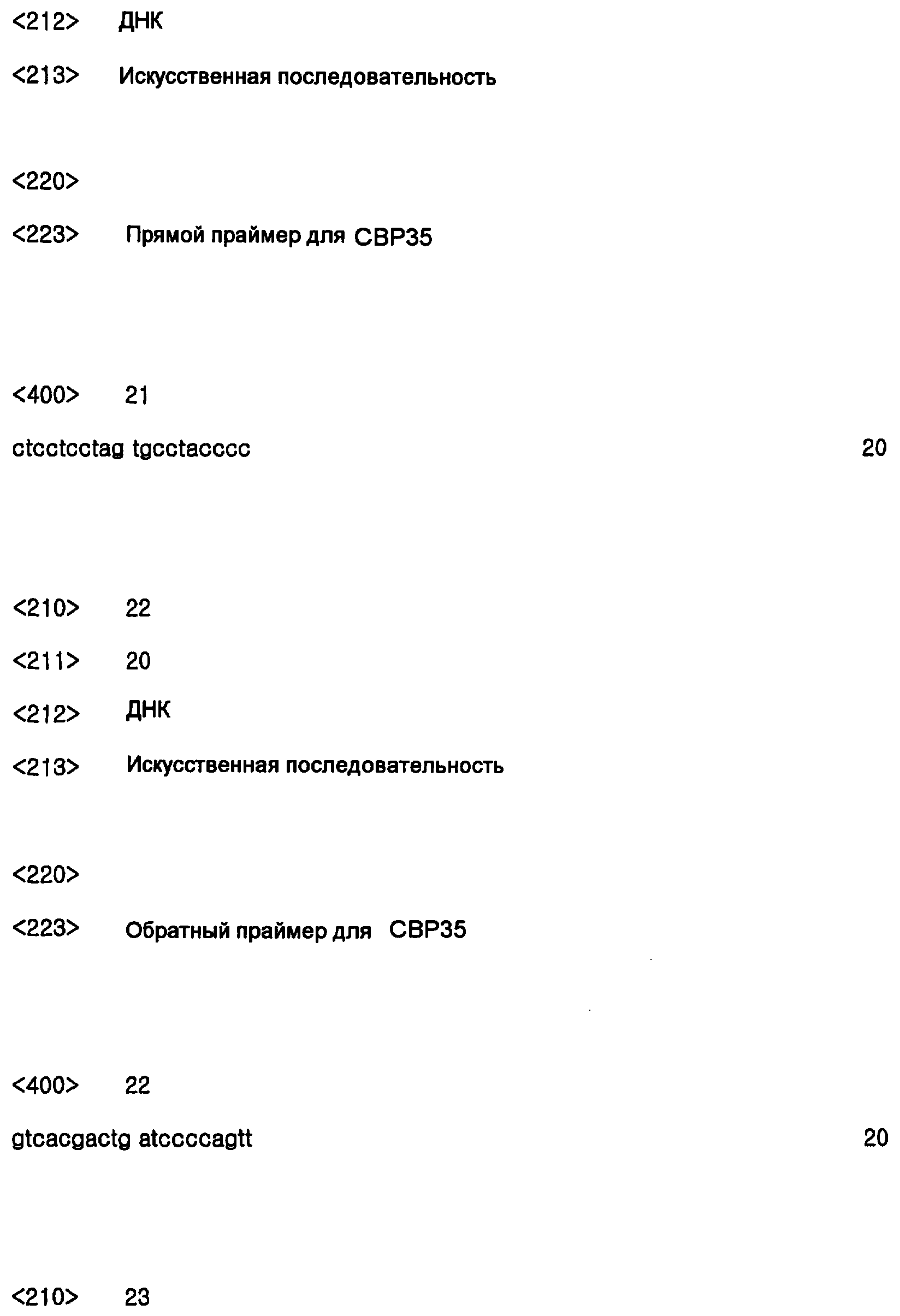 Нуклеотидные последовательности, представленные SEQ ID NO:21 и NO:22, представляют собой праймерные последовательности, используемые для ОТ-ПЦР с углевод-связывающим белком (CBP) 35 в примере 6.
