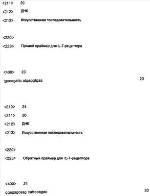 Нуклеотидные последовательности, представленные SEQ ID NO:23 и NO:24, представляют собой праймерные последовательности, используемые для ОТ-ПЦР с рецептором IL-7 в примере 6.