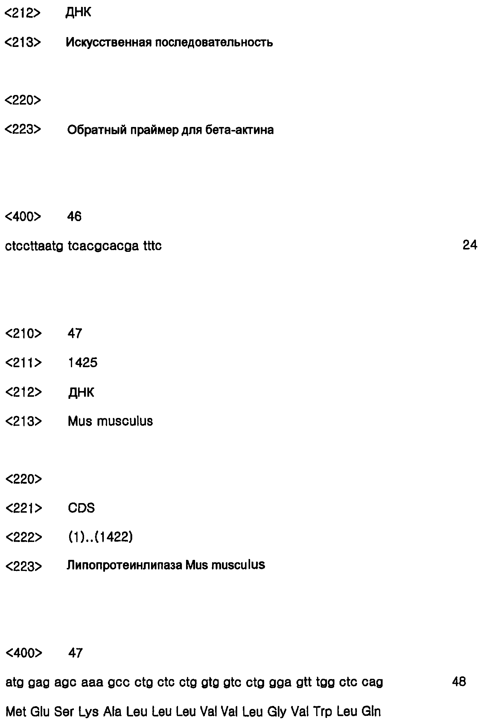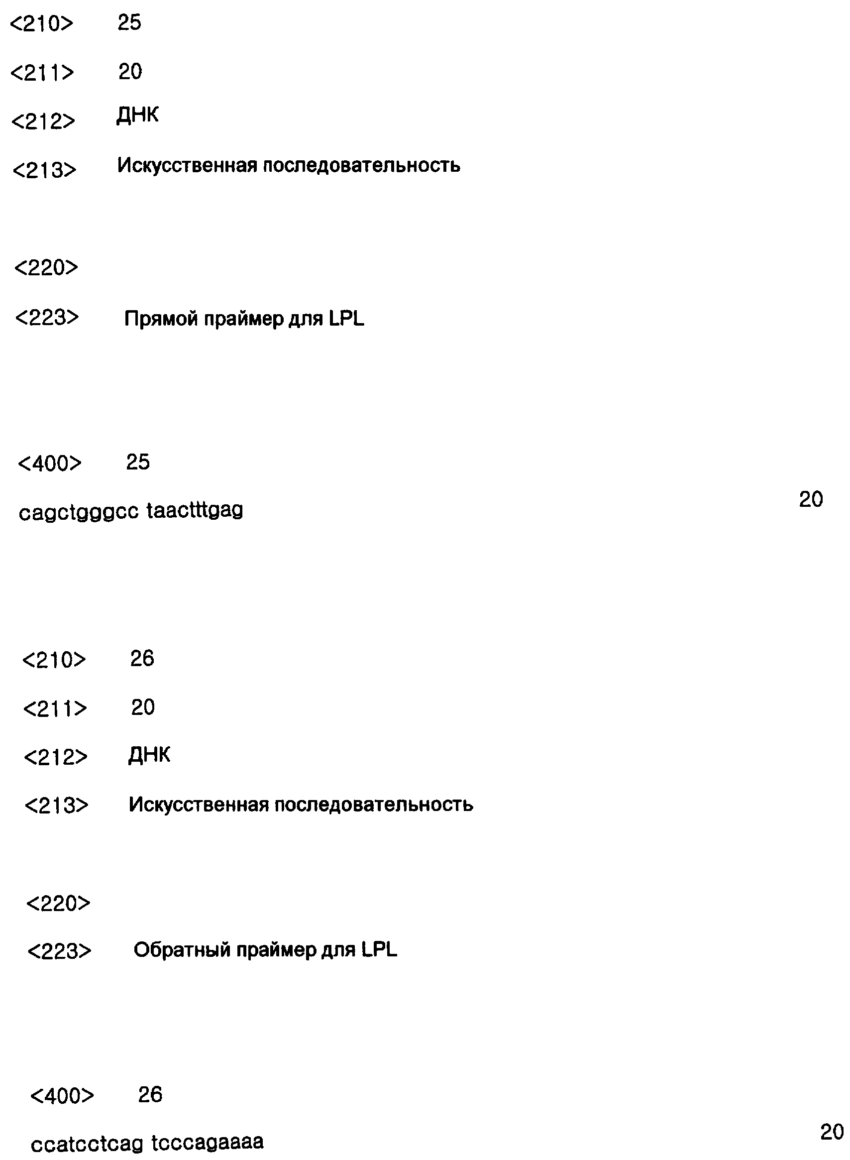 Нуклеотидные последовательности, представленные SEQ ID NO:25 и NO:26, представляют собой праймерные последовательности, используемые для ОТ-ПЦР с липопротеинлипазой (LPL) в примере 6.