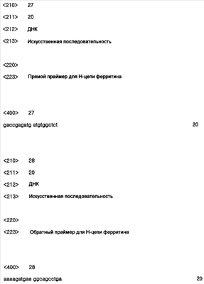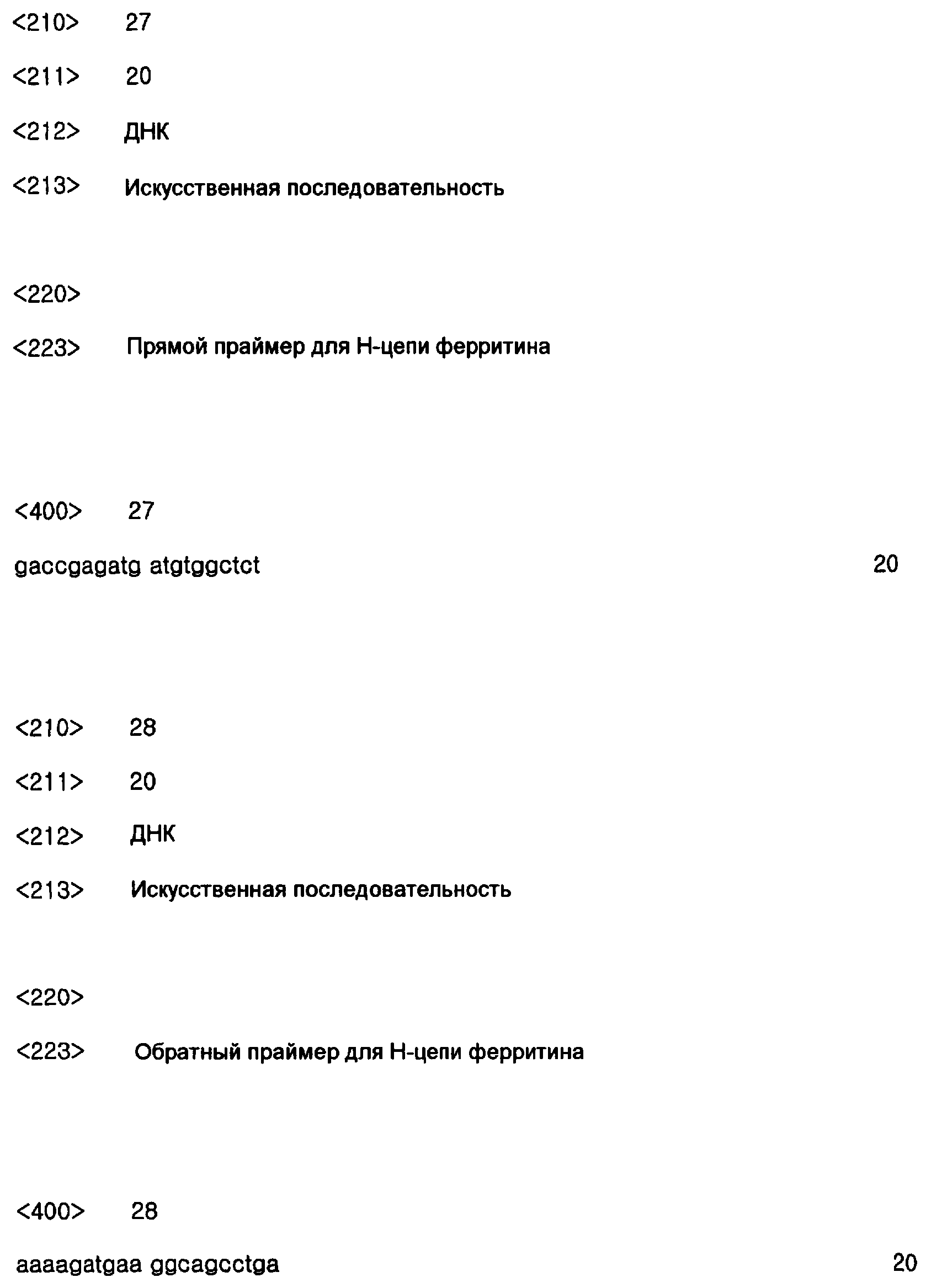 Нуклеотидные последовательности, представленные SEQ ID NO:27 и NO:28, представляют собой праймерные последовательности, используемые для ОТ-ПЦР с H-цепью ферритина в примере 6.