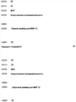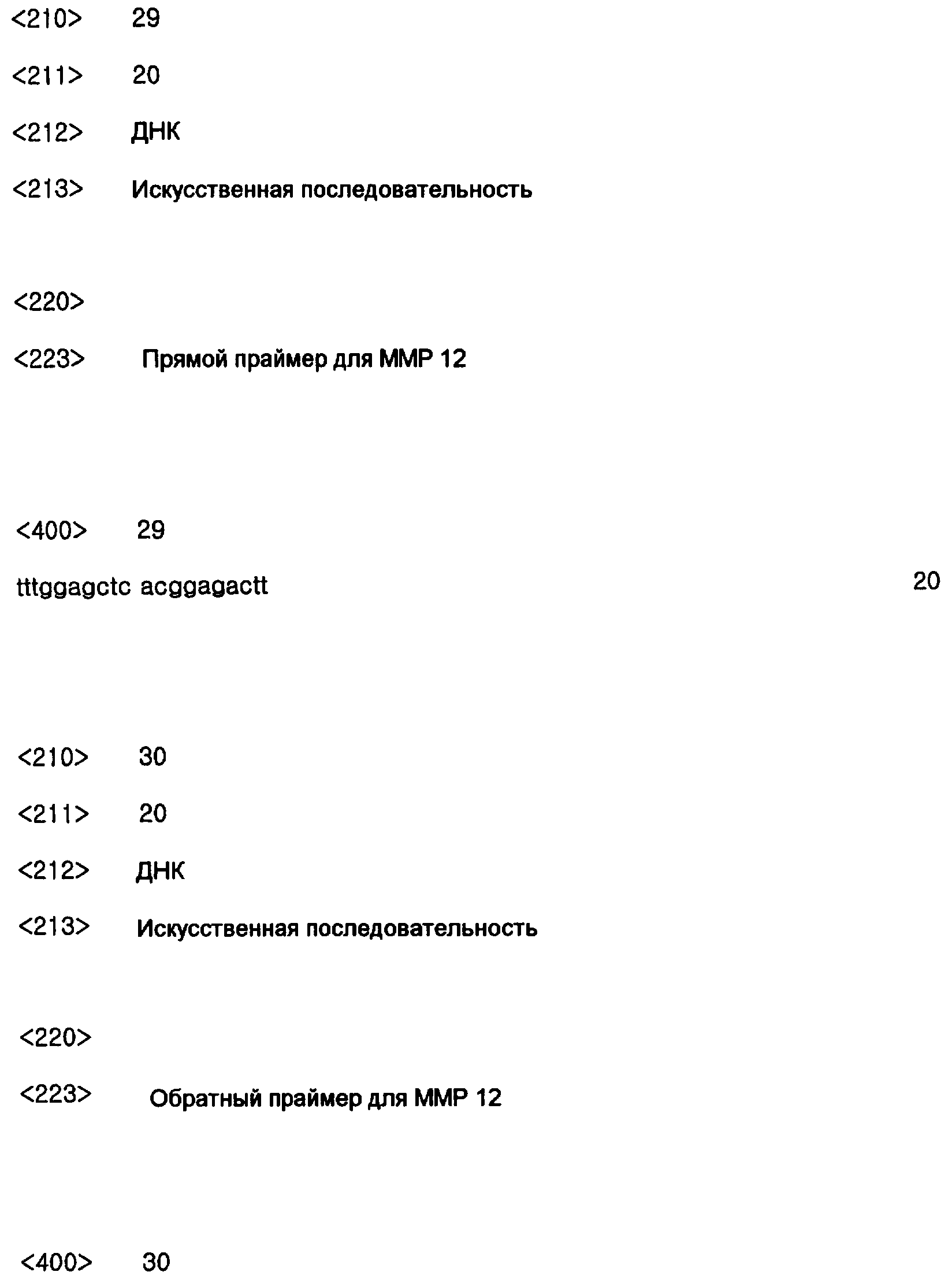 Нуклеотидные последовательности, представленные SEQ ID NO:29 и NO:30, представляют собой праймерные последовательности, используемые для ОТ-ПЦР с матриксной металлопротеиназой (MMP) 12 в примере 6.