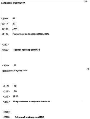 Нуклеотидные последовательности, представленные SEQ ID NO:31 и NO:32, представляют собой праймерные последовательности, используемые для ОТ-ПЦР с регулятором передачи сигнала G-белком (RGS) в примере 6.