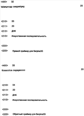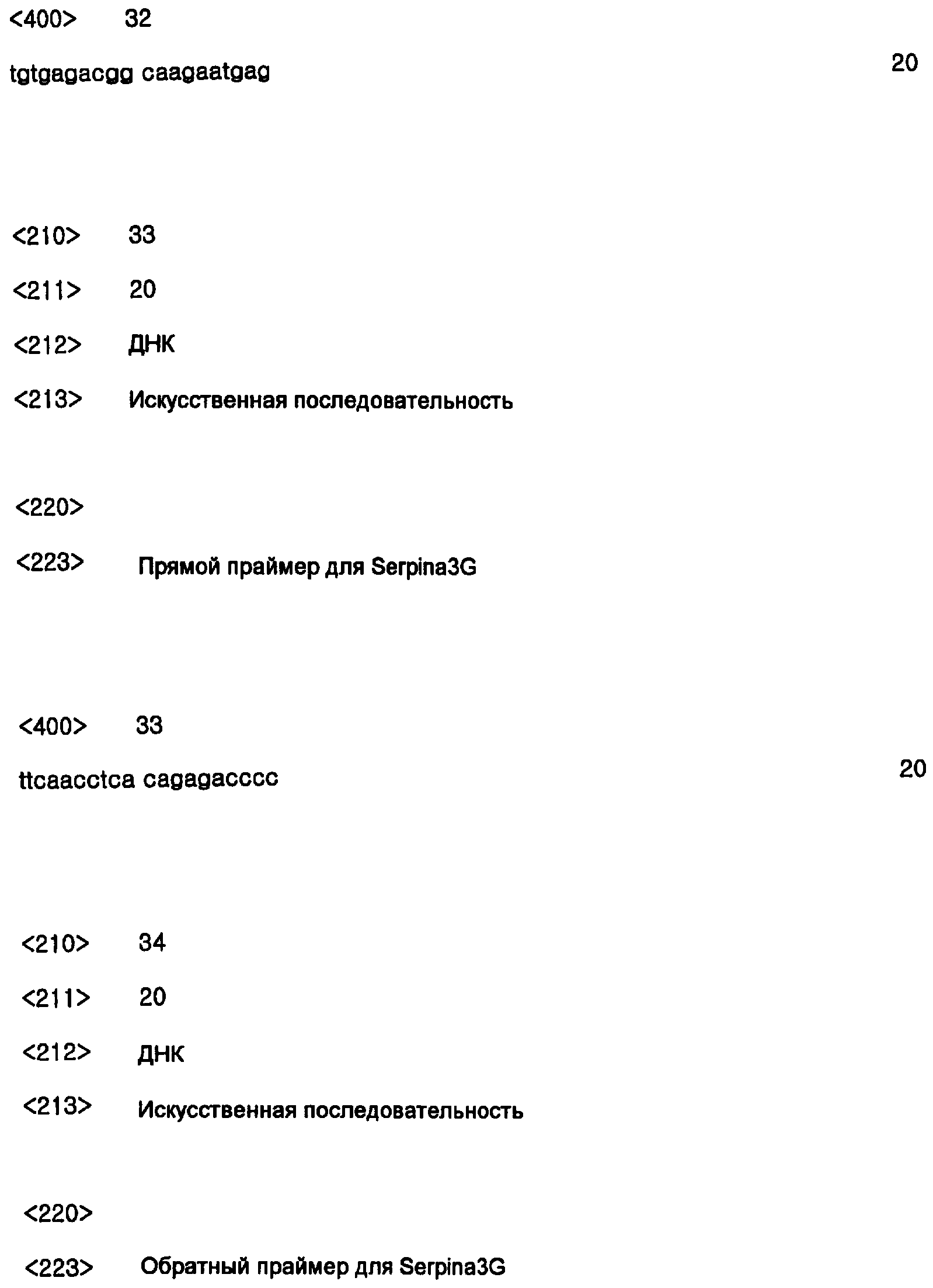 Нуклеотидные последовательности, представленные SEQ ID NO:33 и NO:34, представляют собой праймерные последовательности, используемые для ОТ-ПЦР с серпином 3G в примере 6.