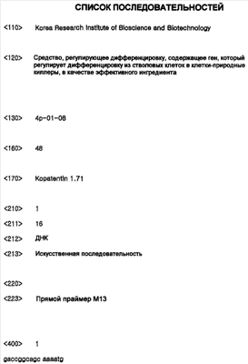 Таким образом, авторы настоящего изобретения идентифицировали новый ген, регулирующий дифференцировку стволовых клеток в NK-клетки, с использованием SAGE (серийного анализа экспрессии генов), и осуществляли данное изобретение, подтверждая то, что дифференцировка NK-клеток регулируется указанным выше геном, и в дальнейшем указанный ген может оказывать большую помощь при лечении заболеваний, включая злокачественные опухоли.