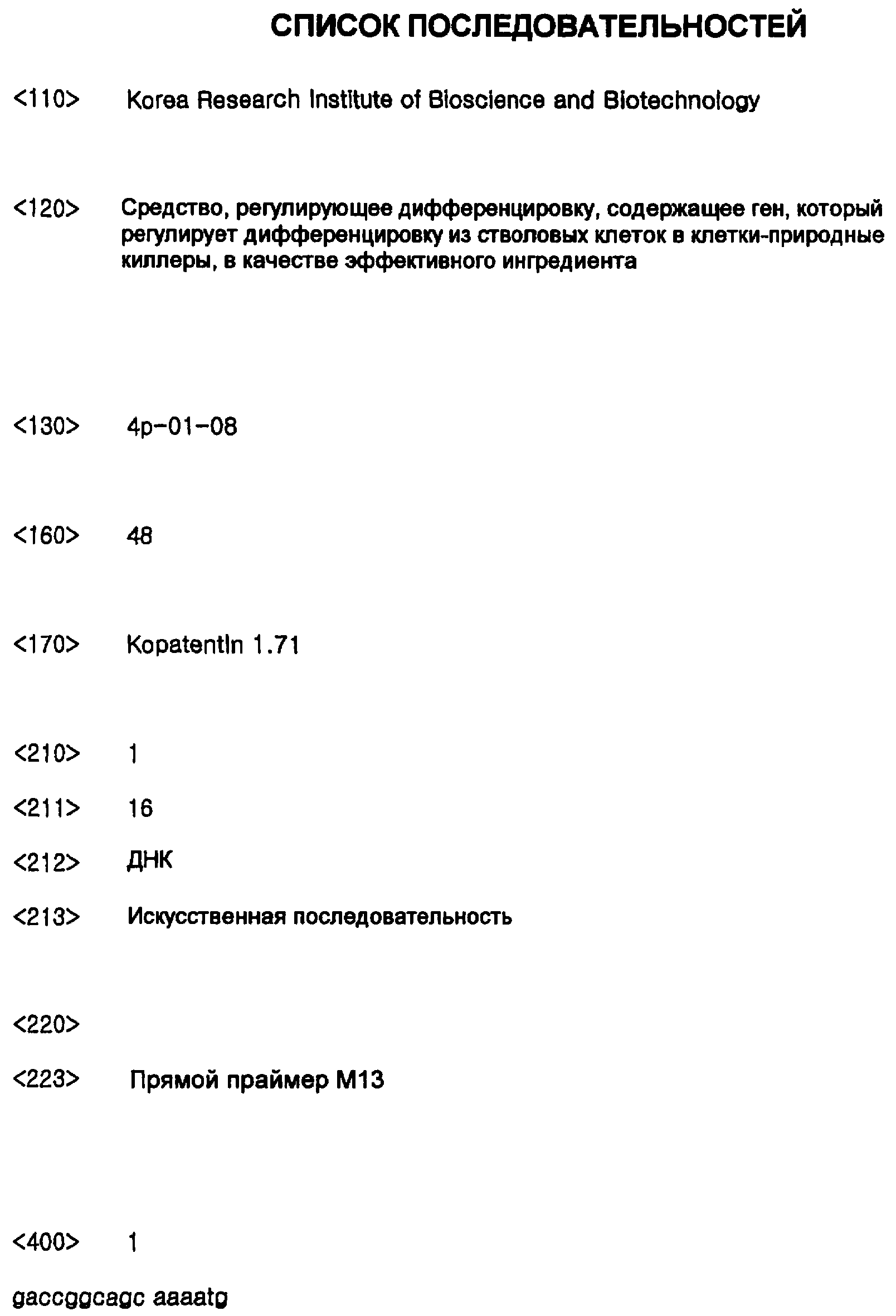 2. Средство, регулирующее дифференцировку клеток-природных киллеров, по п.1, которое регулирует дифференцировку из стволовых клеток в ранние клетки-природные киллеры, где ген выбран из группы, состоящей из белка гомеобокса MIX (AF 154573, SEQ ID NO:49), пре-про-протеиназы 3 (U97073, SEQ ID NO:50), онкогена миелобластоза (Myb) (Ml6449, SEQ ID NO:51), гена 13 кислого комплекса кератина 1 (NM-010662, SEQ ID NO:52), родственной РА-фосфатазе фосфоэстеразы (АК002966, SEQ ID NO:53), гамма-парвина (BC011200, SEQ ID NO:54), родственного forkhead фактора транскрипции 1С (AF339105, SEQ ID NO:55), гена кДНК RIKEN 5730501N20 (AK017744, SEQ ID NO:56), белка c-myc (X01023, SEQ ID NO:57), рибосомного белка L10A (AK002613, SEQ ID NO:58), гена Oct 2b (X53654, SEQ ID NO:59), микролита (AK015601, SEQ ID NO:60), дигидролипоамиддегидрогеназы (BC003368, SEQ ID NO:61) и трикла (U81030, SEQ ID NO:62).