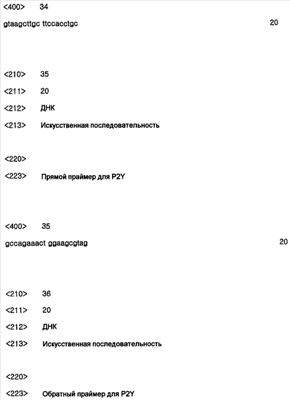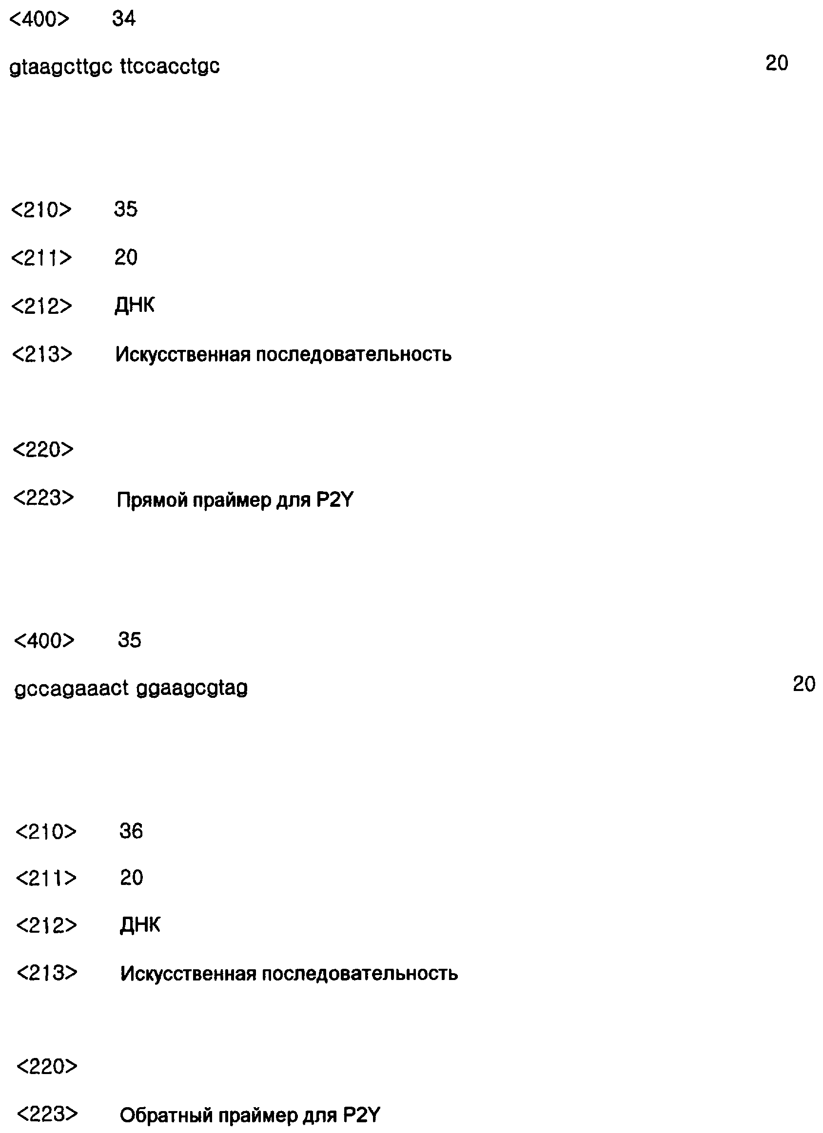 Нуклеотидные последовательности, представленные SEQ ID NO:35 и NO:36, представляют собой праймерные последовательности, используемые для ОТ-ПЦР с пуринергическим рецептором P2Y в примере 6.