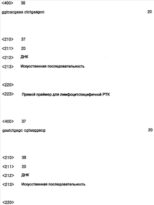 Нуклеотидные последовательности, представленные SEQ ID NO:37 и NO:38, представляют собой праймерные последовательности, используемые для ОТ-ПЦР с лимфоцит-специфичной протеинтирозинкиназой (PTK) в примере 6.