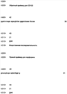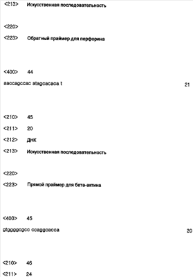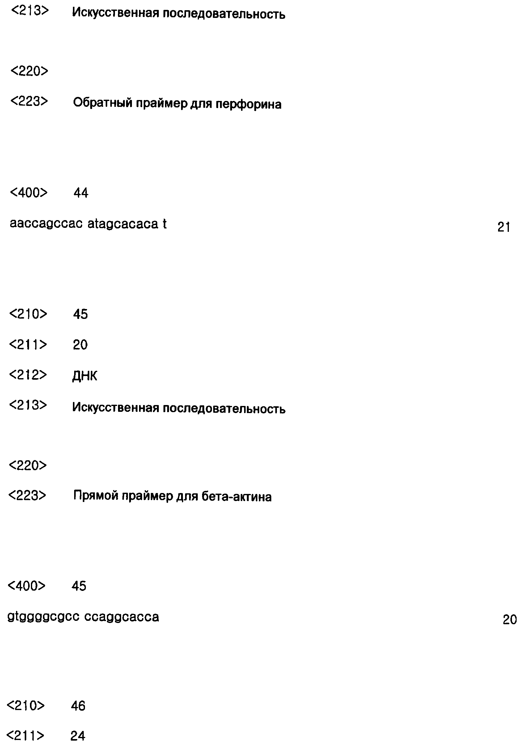 Нуклеотидные последовательности, представленные SEQ ID NO:43 и NO:44, представляют собой праймерные последовательности, используемые для ОТ-ПЦР с перфорином в примере 6.