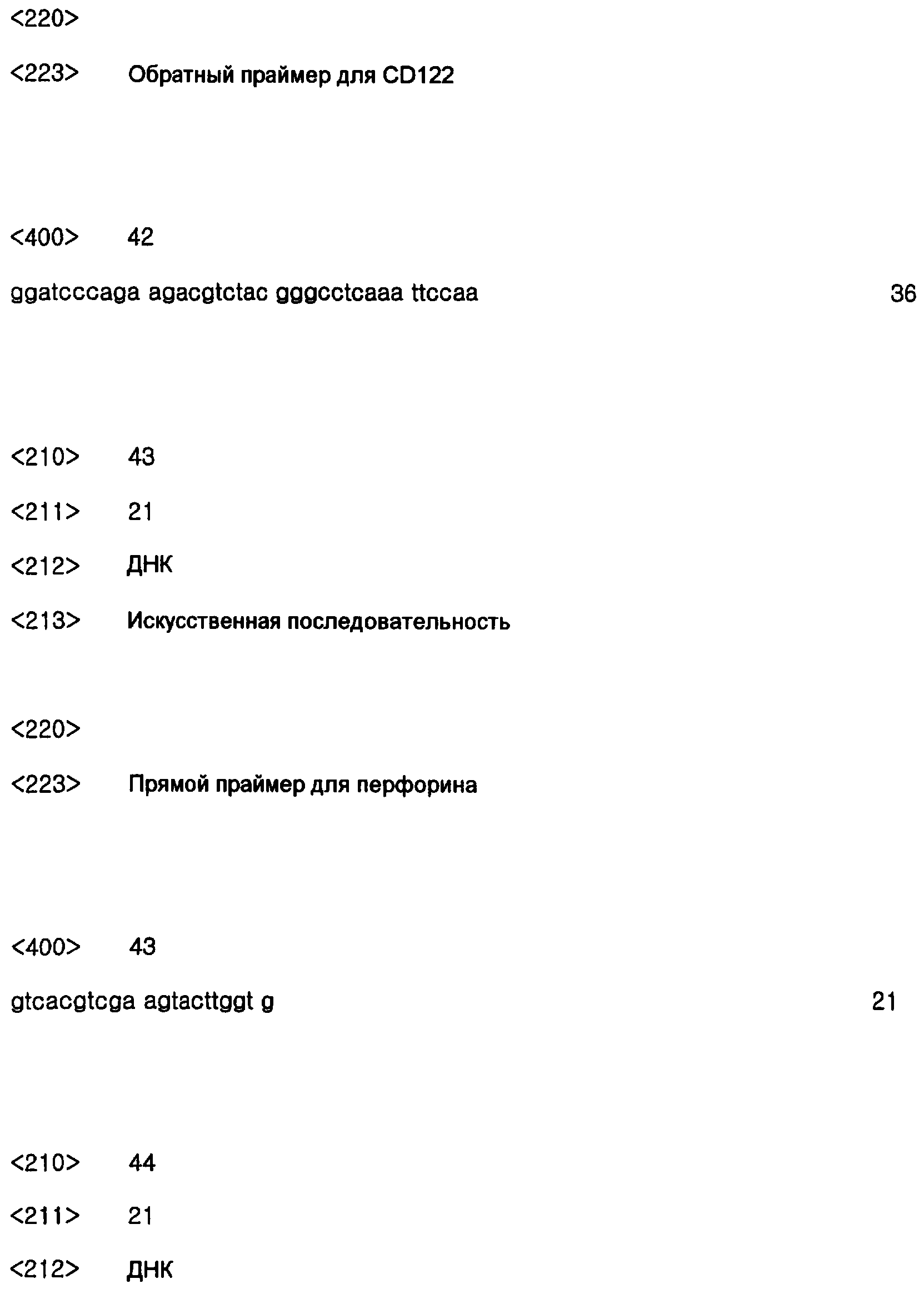 Нуклеотидные последовательности, представленные SEQ ID NO:41 и NO:42, представляют собой праймерные последовательности, используемые для ОТ-ПЦР с CD122 в примере 6.