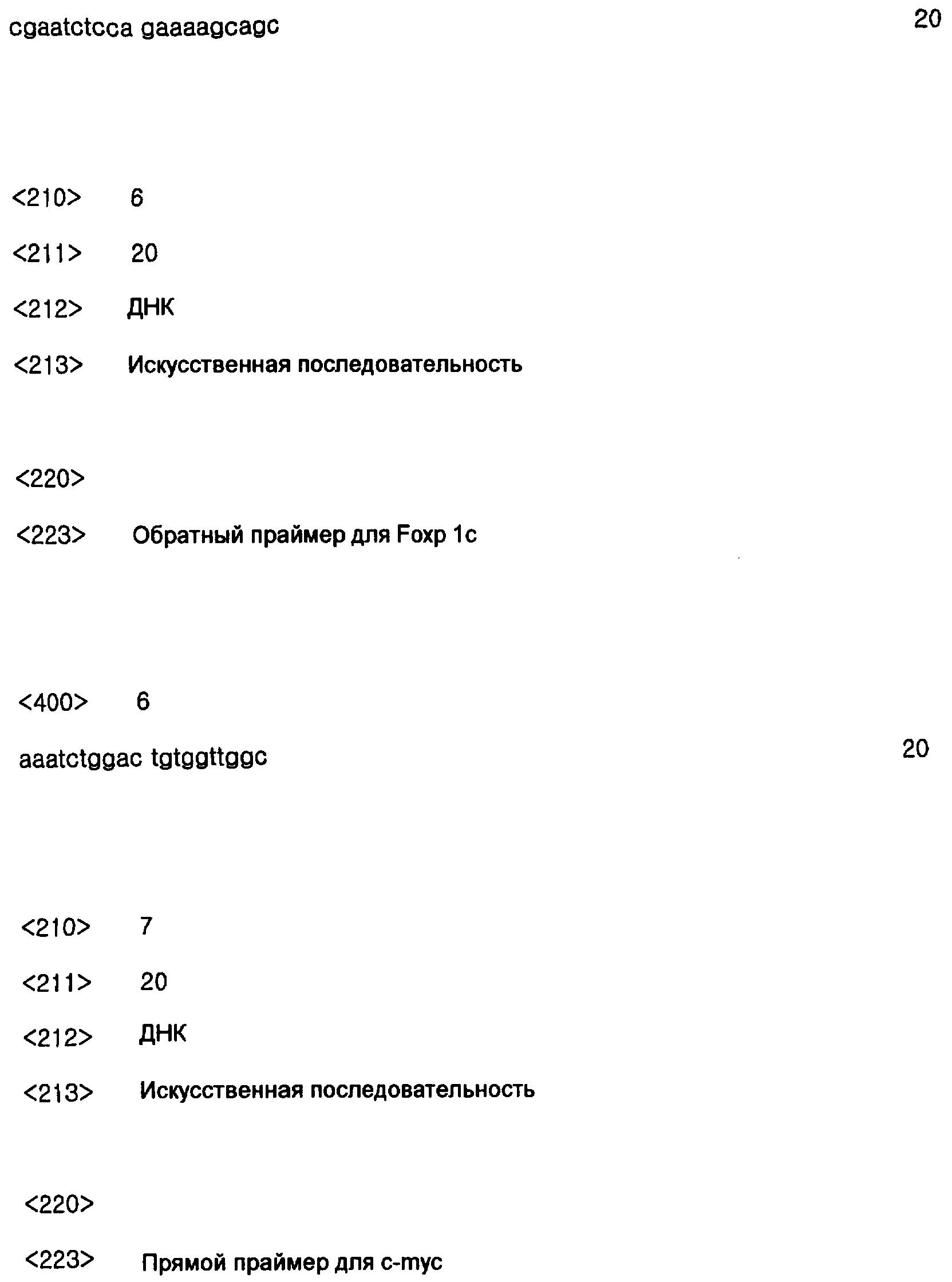 Нуклеотидные последовательности, представленные SEQ ID NO:5 и NO:6, представляют собой праймерные последовательности, используемые для ОТ-ПЦР с forkhead-родственным фактором транскрипции 1 с в примере 6.