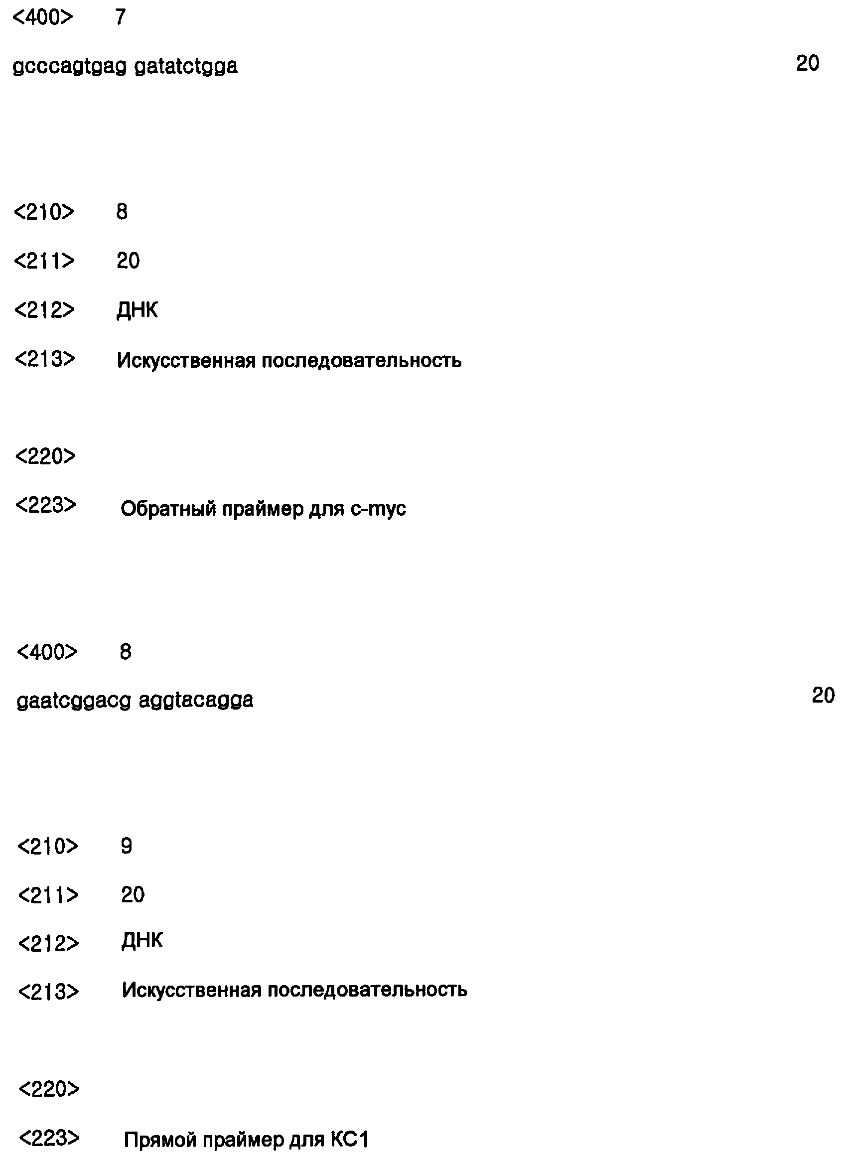 Нуклеотидные последовательности, представленные SEQ ID NO:7 и NO:8, представляют собой праймерные последовательности, используемые для ОТ-ПЦР с белком c-myc в примере 6.
