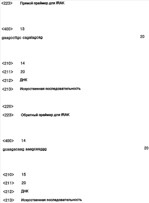Нуклеотидные последовательности, представленные SEQ ID NO:13 и NO:14, представляют собой праймерные последовательности, использованные для ОТ-ПЦР с ассоциированной с рецептором интерлейкина-1 киназой (IRAK) в примере 6.