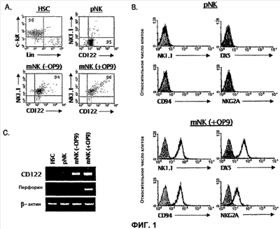 Для индукции дифференцировки в зрелые NK-клетки (обозначенные здесь и далее как mNK-клетки), HSC-клетки получали через 6 суток из культуры и затем культивировали их отдельно или со стромальными клетками OP9 (Science 1994, 265 (5175):1098-1101; Nakano T, Kodama H, Honjo T.: Generation of lymphohematopoietic cells from embryonic stem cells in culture) в присутствии мышиного IL-15 (20 нг/мл, PeproTech). Через 3 суток половину среды заменяли свежей с той же композицией. На 12 сутки NK1.1+клетки отделяли с использованием меченного FITC антитела против NK1.1 и магнитных гранул, конъюгированных с антителом против FITC. Зрелые NK-клетки исследовали путем проточной цитометрии с использованием антител против CD122, NK1.1, DX5 и антител против NK-клеточного рецептора.