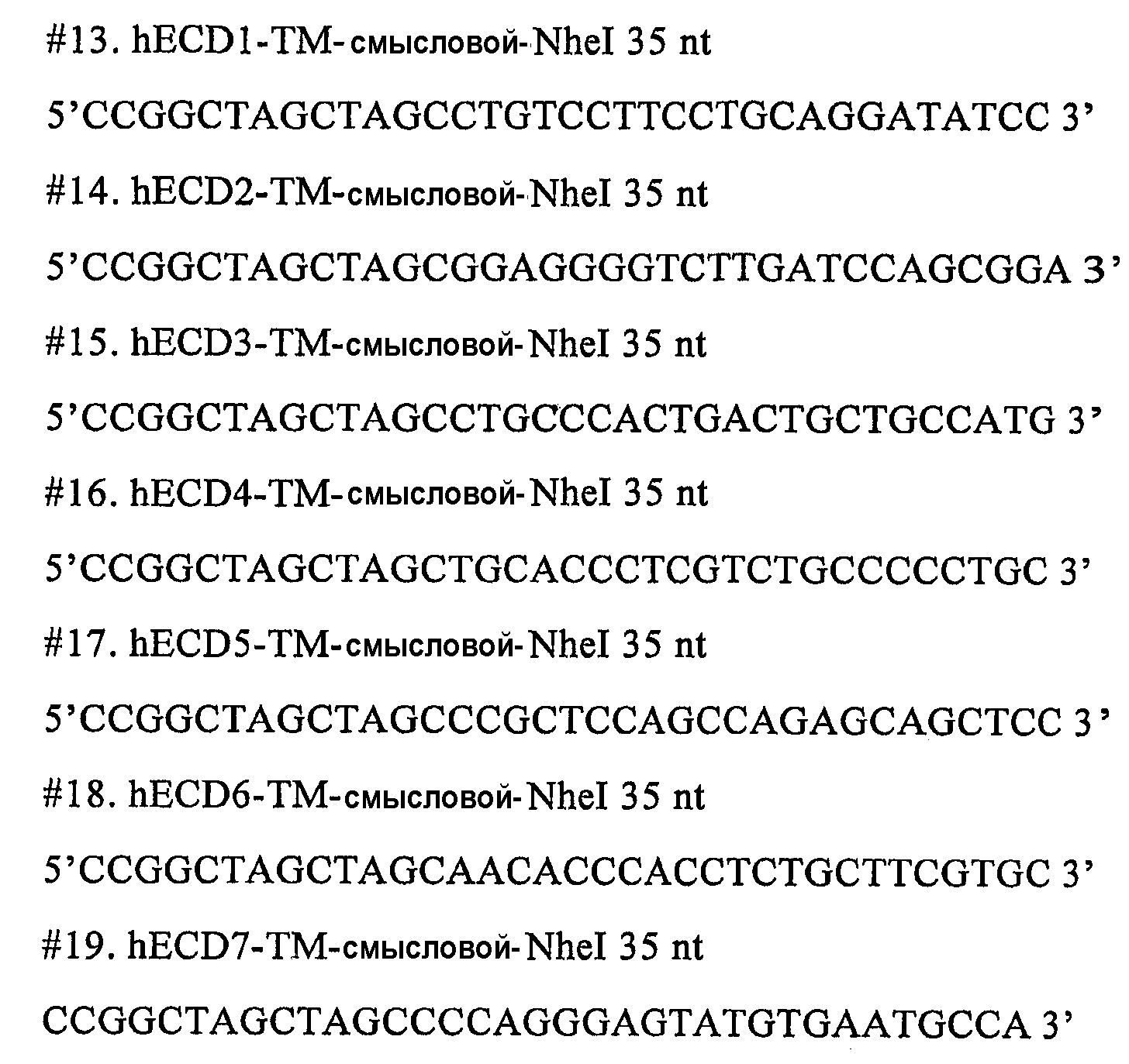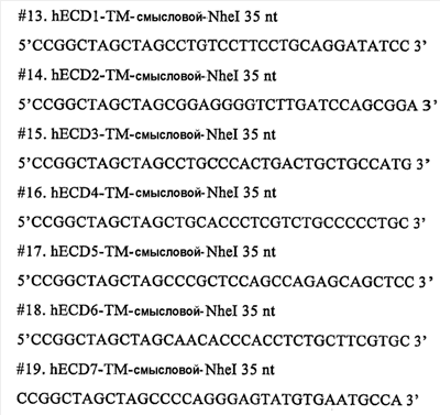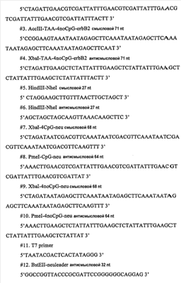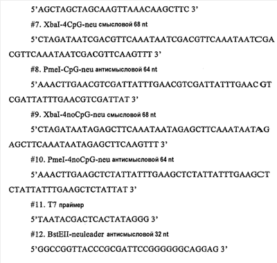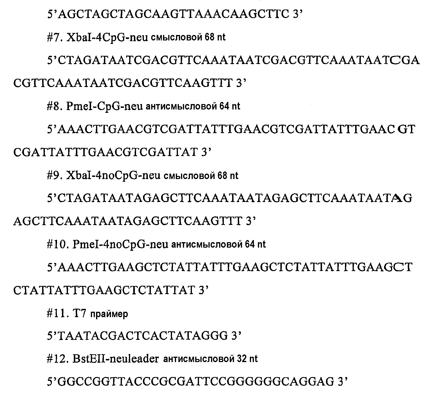 Чтобы добавить далее неспецифические иммунные стимулы, авторы создавали новую основу плазмиды, содержащую 4 иммуностимулирующих последовательности СрС, названные pCMV3.1H/N-4CpG. С этой целью авторы модифицировали pCMV3.1, чтобы удалить один из двух сайтов рестрикции для фермента PmeI и инвертировать сайты рестрикции для HindIII и NneI, присутствующие в множественном сайте клонирования, посредством синтетической последовательности, состоящей из двух олигонуклеотидов: смыслового (олигонуклеотид #5) и антисмыслового (олигонуклеотид #6). В эту новую плазмиду, названную pCMV3.1 H/N, были вставлены две синтетических последовательности, состоящие из двух олигонуклеотидов: смыслового (олигонуклеотид #7, #9) и антисмыслового (олигонуклеотид #8, #10), содержащих четыре повтора для CpG и noCpG последовательностей в уникальных сайтах рестрикции XbaI и PmeI, с получением, таким образом, pCMV3.1 H/N-4CpG и 4noCpG. После этого ДНК-фрагменты hECD-TM-4CpG и hECD-TM-4noCpG были вставлены в pCMV3.1 H/N-4CpG и в pCMV3.1 H/N-4noCpG соответственно, с получением, таким образом, двух новых плазмид, названных pCMV3.1H/N-hECD-TM-8CpG и pCMV3.1H/N-hECD-TM-8noCpG.