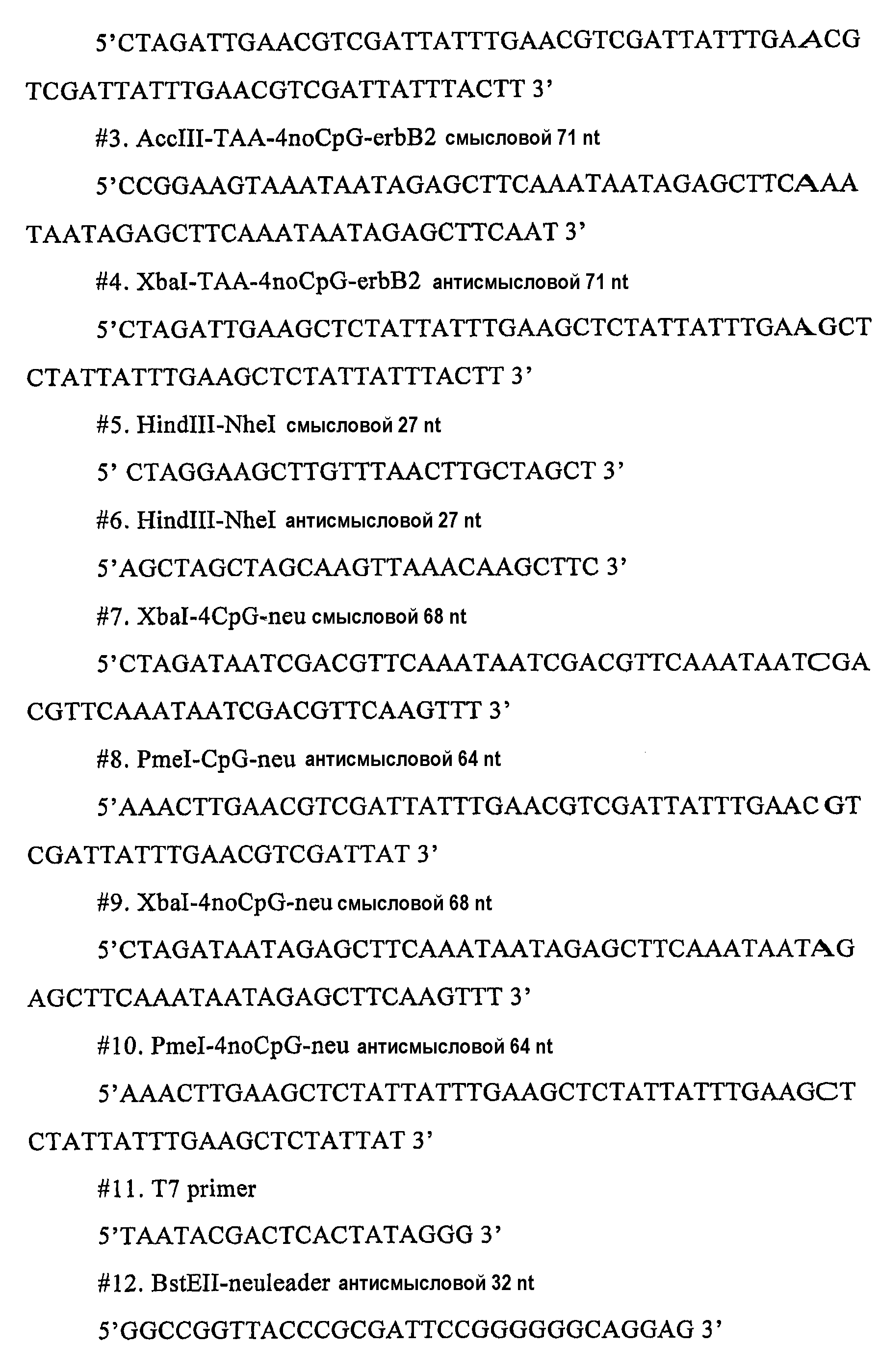 Человеческий p185neu внеклеточный домен характеризуется двумя областями, богатыми цистеинами, известными как 1-й и 2-ой субдомен цистеина (1-й cys и 2-ой cys). В отличие от крысиной кДНК последовательности, содержащей только один сайт BstEII (nt1250) во внеклеточном домене, расположенном в нуклеотидной области, которая отделяет 1-ый cys от 2-ого cys, кДНК последовательность внеклеточного домена ErbB2 имеет два сайта рестрикции для BstEII: в дополнение к сайту в том же самом положении, как в случае крысиного (nt1372), другой сайт BstEII (nt963) присутствует в части, кодирующей 1-ый cys внеклеточного домена. Расщеплением плазмиды pCMV3.1H/NhECD-TM-8CpG с использованием HindIII и BstEII получали фрагмент ДНК, состоящий из 2-ого cys от внеклеточного домена, трансмембранного домена, последовательности 8CpG, и плазмиду pCMV3.1H/N. Затем ферментативной амплификацией ДНК (ПЦР) встраивали сигнал для секреции крысиного p185neu через эндоплазматическую сеть, используя смысловой олигонуклеотид, состоящий из праймера T7 (олигонуклеотид # 11), который распознает Т7 РНК-полимеразу, расположенного в начале pCMV3.1H/N множественного сайта клонирования, и антисмысловой олигонуклеотид (олигонуклеотид #12), имеющий на конце сайт BstEII. После очистки, ферментативного расщепления амплифицированного фрагмента с ферментами рестрикции HindIII и BstEII и последующего клонирования получили pCMV3.1H/Nh2°cys-ТМ-8CpG (фиг.1). Эта плазмида использовалась в экспериментах по вакцинации для сравнения ее с pCMV3.1 H/NhECD-TM-8CpG. После этого получали химерную кДНК, кодирующую слитый белок между 2-ым cys и трансмембранным доменом (nt 1372 – nt 2204) человеческой последовательности и 1-м cys (nt 1 – nt 1250) крысиной последовательности. Восстановление всей последовательности белка слиянием частей, происходящих от крысиной и человеческой кДНК соответственно, позволяет усиливать иммунный ответ.