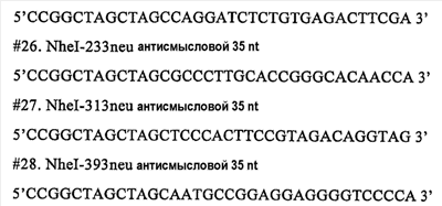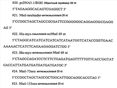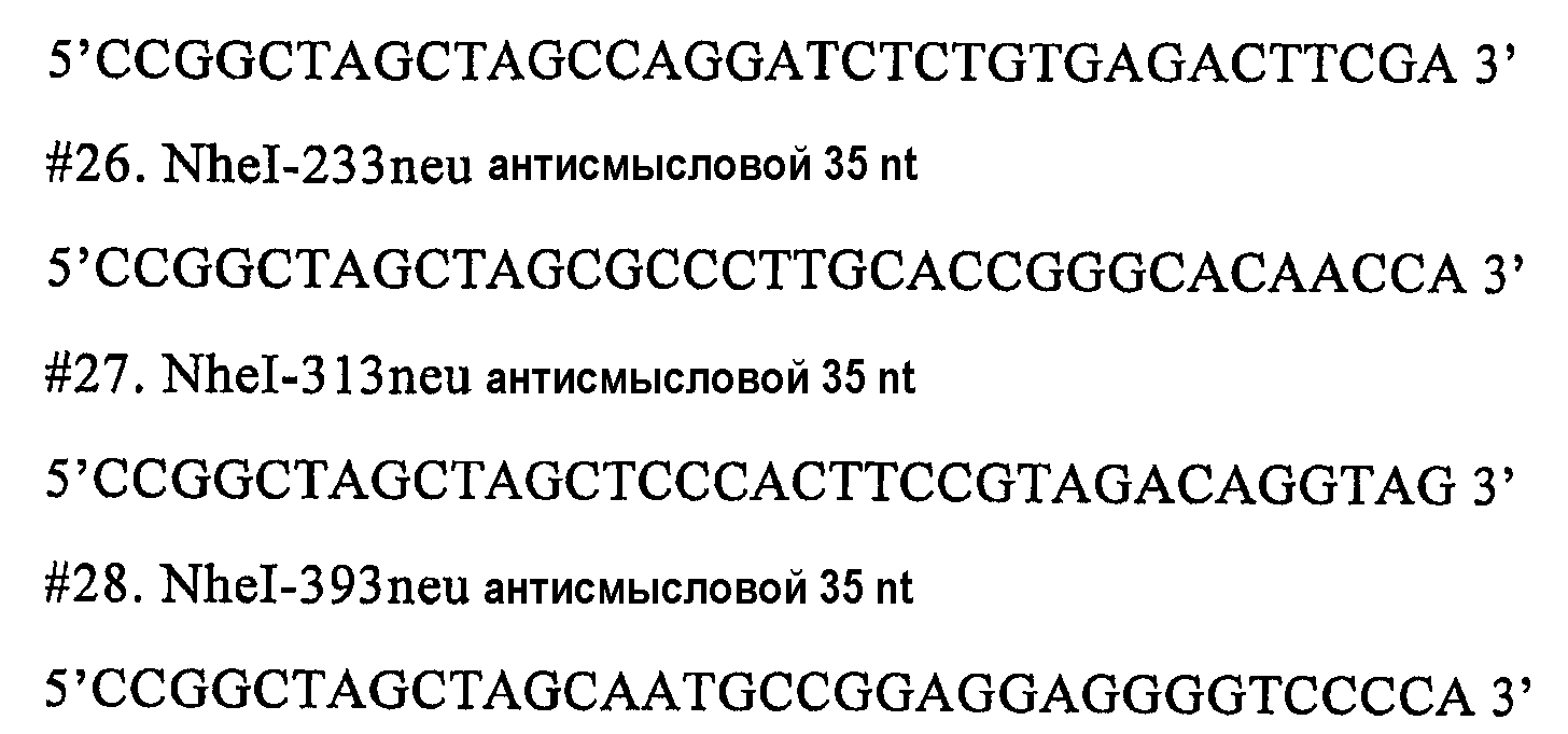 ДНК фрагменты, кодирующие части крысиного p185neu, были получены ферментативной амплификацией ДНК. Для амплификации этих кДНК фрагментов использовали шесть олигонуклеотидов, имеющих одинаковую ориентацию, а именно ориентацию праймера T7 (олигонуклеотид #11), в то время как пять антисмысловых были предназначены для распознавания крысиной кДНК в правильных положениях и имеют сайт рестрикции для NheI на своих концах (олигонуклеотиды #24-#28). После очистки и расщепления рестрикционными ферментами HiNdIII и NheI, амплифицированные фрагменты встраивали в соответствующие плазмиды (pCMV3.1H/NhECD1-ТМ-8CpG, pCMV3.1H/NhECD2-ТМ-8CpG, pCMV3.1H/NhECD3-ТМ-8CpG, pCMV3.1H/NhECD4-ТМ-8CpG, pCMV3.1H/NhECD5-TM-8CpG) и расщепляли теми же самыми ферментами рестрикции. Таким образом, получили пять новых плазмид, способных кодировать химерные белки из 689 аминокислот, из которых 2 (Val-Ser) относятся к сайту рестрикции NheI, используемому для конъюгирования крысиной и человеческой ДНК. Наличие этих двух аминокислот делает гетеролитическими как человеческие, так и крысиные части.