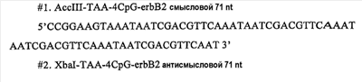Цитоплазматический домен был удален с использованием фермента AccIII, присутствующего в качестве уникального сайта рестрикции, и фермента XbaI. Для повторного встраивания на 3′ концах ДНК ErbB2 ECD-TM триплета нуклеотидов TAA, распознаваемого как сигнал остановки трансляции, авторы использовали две синтетических последовательности, состоящие из двух олигонуклеотидов: смыслового (олигонуклеотид #1, #3) и антисмыслового (олигонуклеотид #2, #4), содержащих сайты рестрикции AccIII и XbaI на своих концах. В этих синтетических последовательностях есть также четыре повторяющихся последовательности CpG и noCpG. Последний используется как отрицательный контроль. Эти две новых плазмиды назвали pCMV3.1hECD-ТМ-4CpG и pCMV3.1hECD-ТМ-4noCpG.