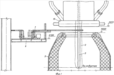 Размещение смывного кольца 4 на поворотной консоли 5, закрепленной на колонне 6, обусловлено необходимостью соосного размещения смывного кольца 4 с фурмой 3 над горловиной конвертера 9 над кессоном камина 10 газоотводящего тракта во время удаления настылей с продувочной фурмы и перемещения его в холодную зону после завершения этого процесса.