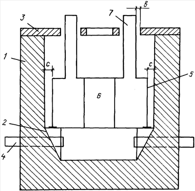 На чертеже показаны: футеровка 1, скос подины 2, перекрытие 3, электроды 4, колпак 5, центральная камера 6, патрубки для загрузки и выгрузки магния 7, b – зазор между патрубками и перекрытием, с – зазор между колпаком и футеровкой.