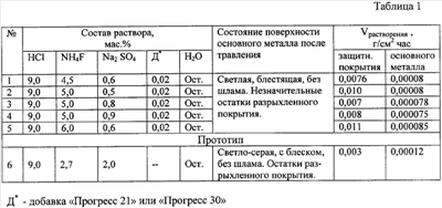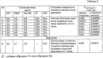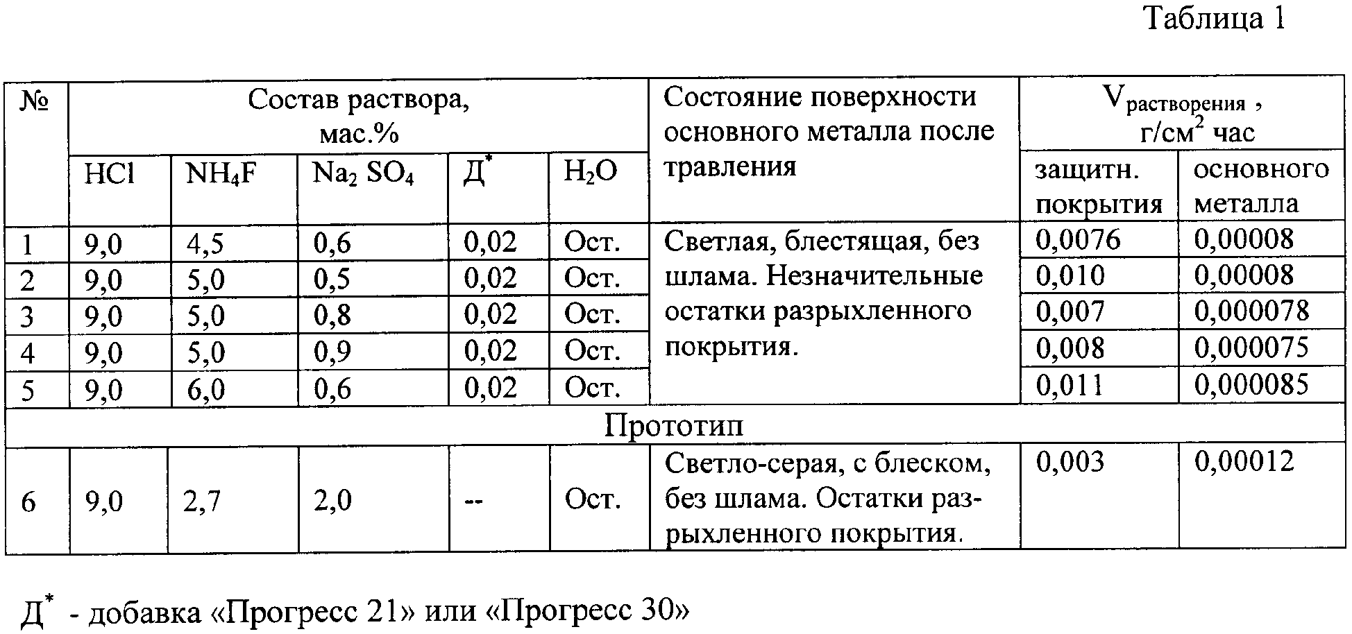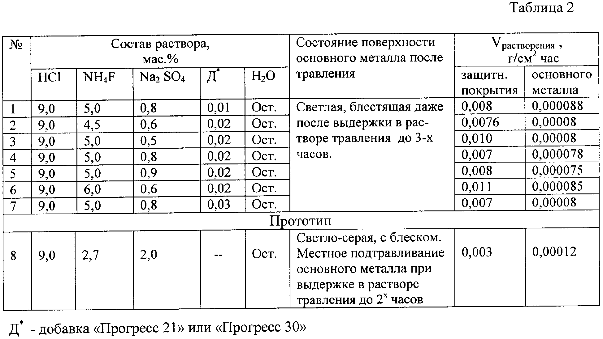 Использование раствора может быть проиллюстрировано примерами. В качестве образцов использовались детали из сплава ЭИ961-Ш (основной металл) с нанесенным ионно-плазменным напылением защитным покрытием Ti+TiN общей толщиной 10-15 мкм. Были приготовлены растворы, содержащие воду – основа; хлористо-водородную кислоту 9 мас.%; добавку «Прогресс 21» (ТУ 2383-003-49798713-99) или «Прогресс 30» (ТУ 38.10719-92) – 0,02 мас.%; которые отличались содержанием аммония фтористого и сульфата натрия. Контрольный образец детали обрабатывали раствором: хлористо-водородная кислота 9,0 мас.%; аммоний фтористый 2,7 мас.%; сульфат натрия 2,0 мас.%; вода – остальное, взятым за прототип. Удаление покрытия производилось при температуре помещения 21-22°С. Время травления 0,5-3,0 часа. Результаты приведены в табл. 1. Оценивалось состояние поверхности основного металла и скорости растворения (Vрастворения) защитного покрытия и основного металла. Увеличение концентрации аммония фтористого (иона F– – определяющего параметра при травлении титана) с одновременным снижением концентрации сульфата натрия повышает скорость растворения защитного покрытия, уменьшая время воздействия раствора на основной металл. Оптимальная концентрация аммония фтористого 4,5-6,0 мас.%. При концентрации менее 4,5 мас.% – недостаточны скорость и качество удаления покрытия. Увеличение концентрации более 6 мас.% повышает скорость растворения защитного покрытия, но ухудшается качество поверхности основного металла: потемневшая поверхность с матовыми участками. Оптимальная концентрация сульфата натрия 0,5-0,9 мас.%. При увеличении концентрации свыше 0,9 мас.% снижается качество удаления защитного покрытия, а при уменьшении концентрации менее 0,5 мас.% ухудшается качество поверхности основного металла: темная поверхность с трудноудаляемым черным шламом. Введение добавки «Прогресс 21» или «Прогресс 30» обеспечивает равномерное травление, улучшает качество поверхности основного металла детали: поверхность после травления светлая и блестящая, без растравливания (при просмотре травленой поверхности под увеличением до ×25; металлографическое исследование). Установлено, что оптимальная концентрация добавки «Прогресс 21» или «Прогресс 30» находится в пределах 0,01-0,03 мас.%. При снижении концентрации менее 0,01 мас.% возрастает скорость растворения основного металла, а при увеличении концентрации более 0,03 мас.% при травлении наблюдается повышенное ценообразование. На скорость растворения защитного покрытия добавка “Прогресс 21” или «Прогресс 30» не оказывает существенного влияния (табл. 2). По сравнению с прототипом скорость растворения покрытия увеличилась в 2,5-3,6 раза без ухудшения качества поверхности основного металла (растворение основного металла практически отсутствует).