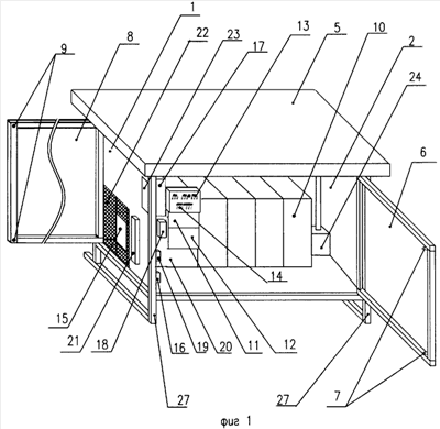 В жаркую погоду в соответствии с сигналом, поступающим от датчика температуры в устройство управления, привод подъема/опускания крыши 24 удерживает последнюю в крайнем верхнем положении. При этом отвод тепла от штыревого теплоотвода модуля 10 обеспечивается конвекцией за счет отверстий в дне 4 корпуса, отверстий в защитной сетке и зазором по всему периметру крыши между внутренней ее поверхностью и защитной сеткой, а также между боковыми стенками корпуса, внешними поверхностями передней и боковой дверей и между боковыми вертикальными стенками нависающей над корпусом крыши 5. В холодную погоду по сигналу от датчика температуры устройство управления подает на привод подъема/опускания крыши 24 команду на опускание крыши 5. Таким образом, узлы преобразователя напряжения 10 в период неблагоприятных погодных условий являются более защищенными.
