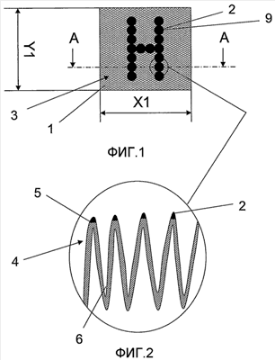 На фиг.1 показано первое воплощение изобретения, где слой 1 с изображением длиной Х1 (направление Х) и шириной Y1 (направление Y) находится в первом состоянии. Здесь изображение состоит из нескольких отдельных черных точек 9, которые совместно образуют букву Н. На фиг.1 слой 1 находится в стянутом состоянии, в котором он собран в складки. Поэтому на фиг.1 показан слой 1 в сморщенном первом состоянии. Тот факт, что этот слой собран в складки, показан на фиг.1 волнообразным узором 3. Слой может складываться в направлении Х, в направлении Y или и в направлении Х, и в направлении Y. Сморщенный слой 1 имеет выступы и углубления между ними. На фиг.1 точки 9 были образованы краской, нанесенной на точки к слою таким образом, чтобы несколько волнообразных выступов были окрашены, когда слой 1 находится в сморщенном состоянии. Это будет объяснено более подробно в связи с фиг.2.