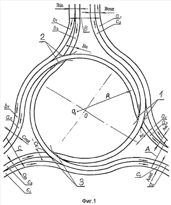 Проезжая часть дороги А с полосой а1 отделяется от проезжей части Ac до развязки и строится сначала путем создания правого поворота большого радиуса, затем левого поворота большого радиуса и тем самым соединяется с проезжей частью Cc дороги С, которая проходит рядом с ней слева. Объединенная проезжая часть построена путем создания правого поворота большого радиуса, который ведет на дорогу В и образует ее проезжую часть Bout с полосами а1 и с2. Другая проезжая часть Ac дороги А построена путем создания правого поворота большого радиуса с уклоном к эстакаде 1 и проходящего под ней, затем левого поворота большого радиуса с подъемом, который ведет на эстакаду 2 и по ней. Центр радиуса левого поворота смещен вперед в направлении движения за геометрический центр развязки и влево от него. За эстакадой эта проезжая часть соединяется с проезжей частью дороги В с полосой b1, которая проходит рядом с ней справа. Эта соединенная проезжая часть, сначала делая левый, а затем правый поворот большого радиуса, ведет на дорогу С и образует ее проезжую часть Cout.