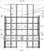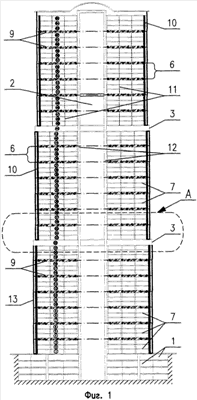 Для примера на фиг.1-6 приведено высотное здание, состоящее из 3-х частей, опирающихся: нижняя – на основание – фундаментную конструкцию 1, средняя и верхние части опираются на опорные платформы 3. Каждая часть здания состоит из семи ярусов 6, каждый – по 3 этажа, таким образом, общая высотность примера высотного здания – 66 этажей (включая три технических этажа). В основании фундаментные конструкции выполнены в виде подземного паркинга из монолитных железобетонных конструкций.